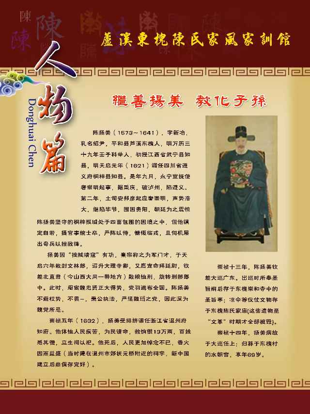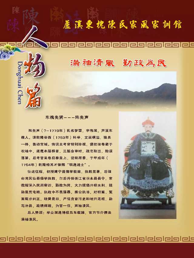 清"从戎远征,勇猛平乱"的四川成都总兵陈师助(平和芦溪籍);清乾隆年间两袖清风、勤政为民的明通进士陈先声(平和芦溪籍);清嘉庆年间国子监琉球教习陈锦湖(永定籍),等等。为国家的发展与民族的振兴作出了巨大贡献,书写了永垂不朽的历史篇章。