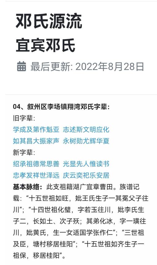 近日,笔者在四川宜宾叙州区李场拜读了当地于清朝康熙年间,自湖南宜章县入川的鄧氏学芳公后裔(如翰公系)《鄧氏族谱》,对相关世系源流有一定的了解,为弘扬移民文化,传承华夏文明,现将有关入川及世系源流情况载述于下,供大家研讨时参考,不足之处望多指教。