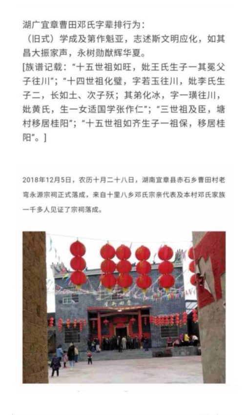 曹田邓氏派开迁徙遍布于湘粤川黔京等地,树发千枝,蔓及四方。
