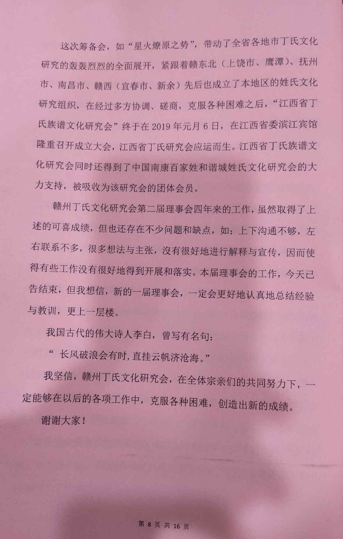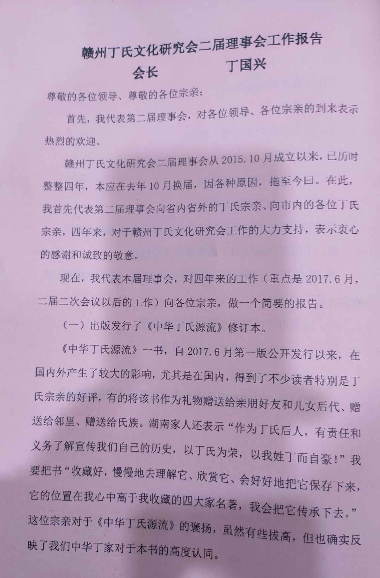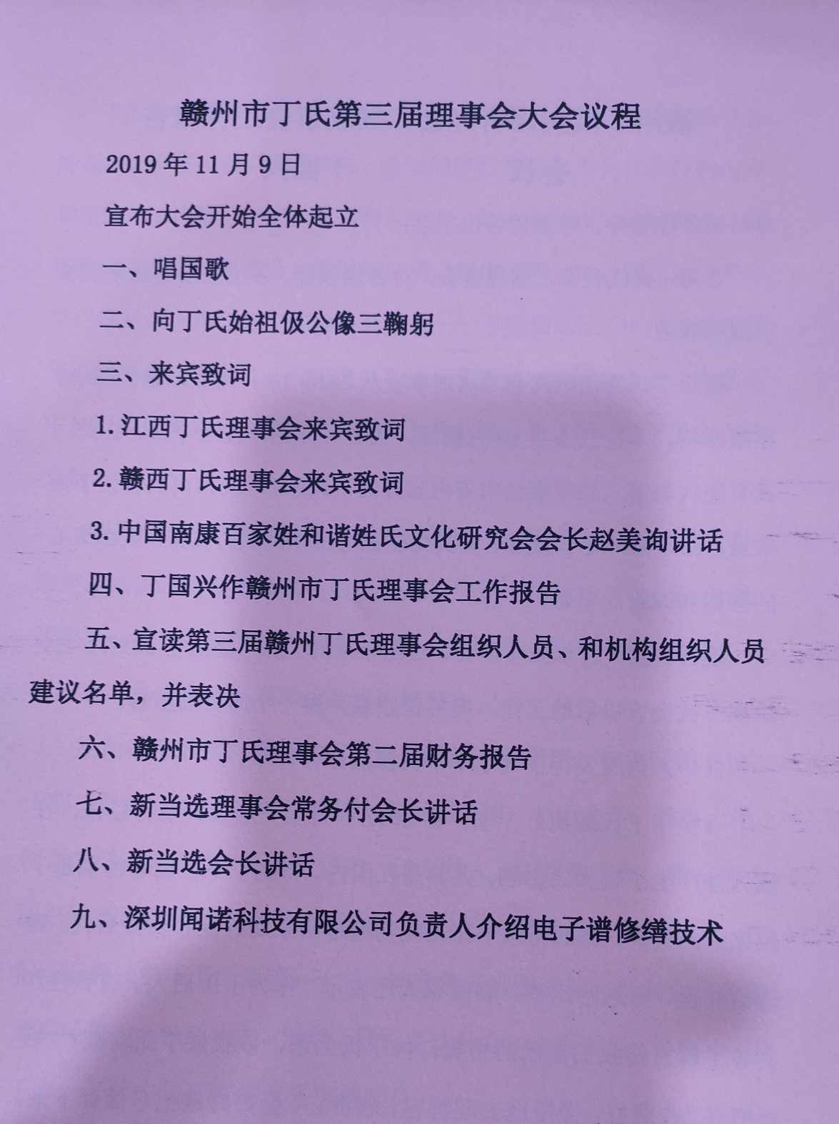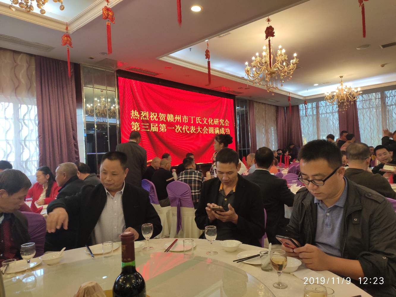 11月9日赣州市丁氏文化研究会第三届第一次代表大会。在赣州铁龙大酒店召开。此次会议邀请赣南18个县市区的丁氏宗亲代表参加,深圳闻诺科技赣州分公司钟惠金,冯财萌,陈东北也应邀参与。