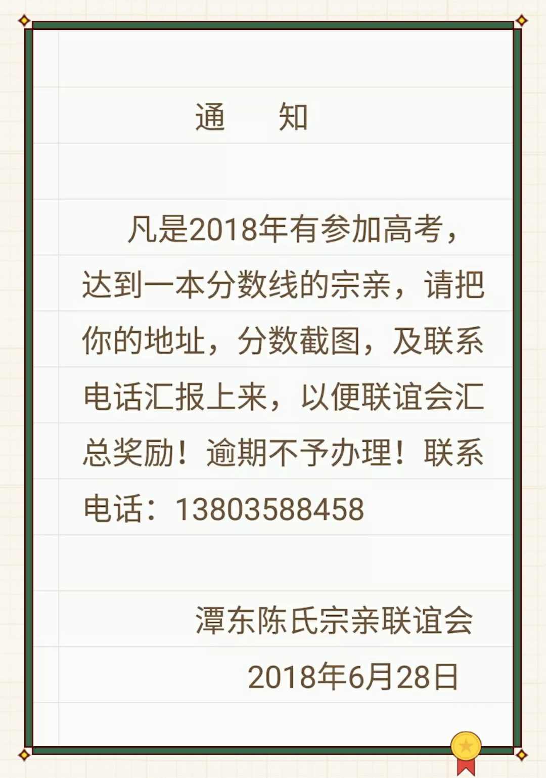 潭东陈氏联谊会2018年度助学育才简报