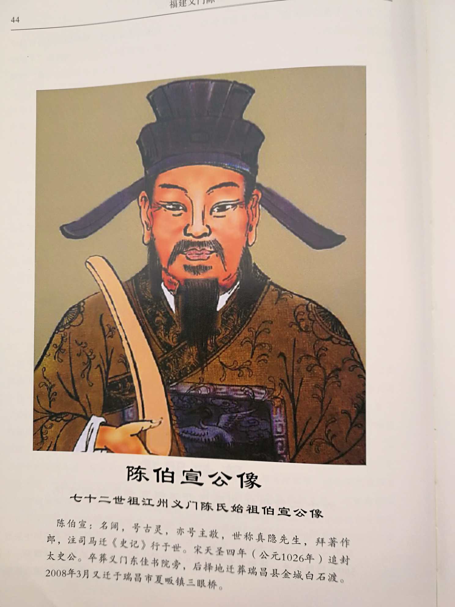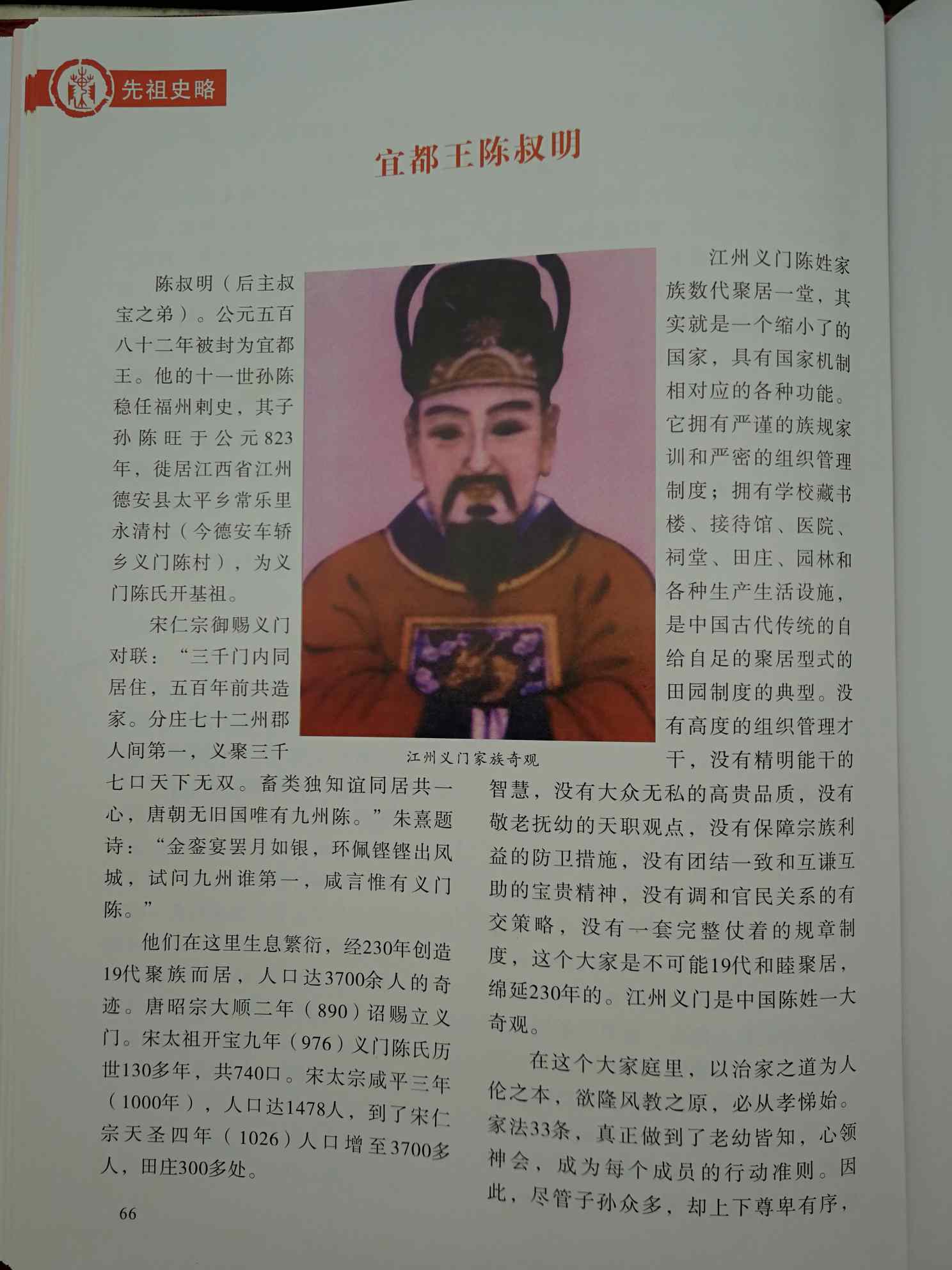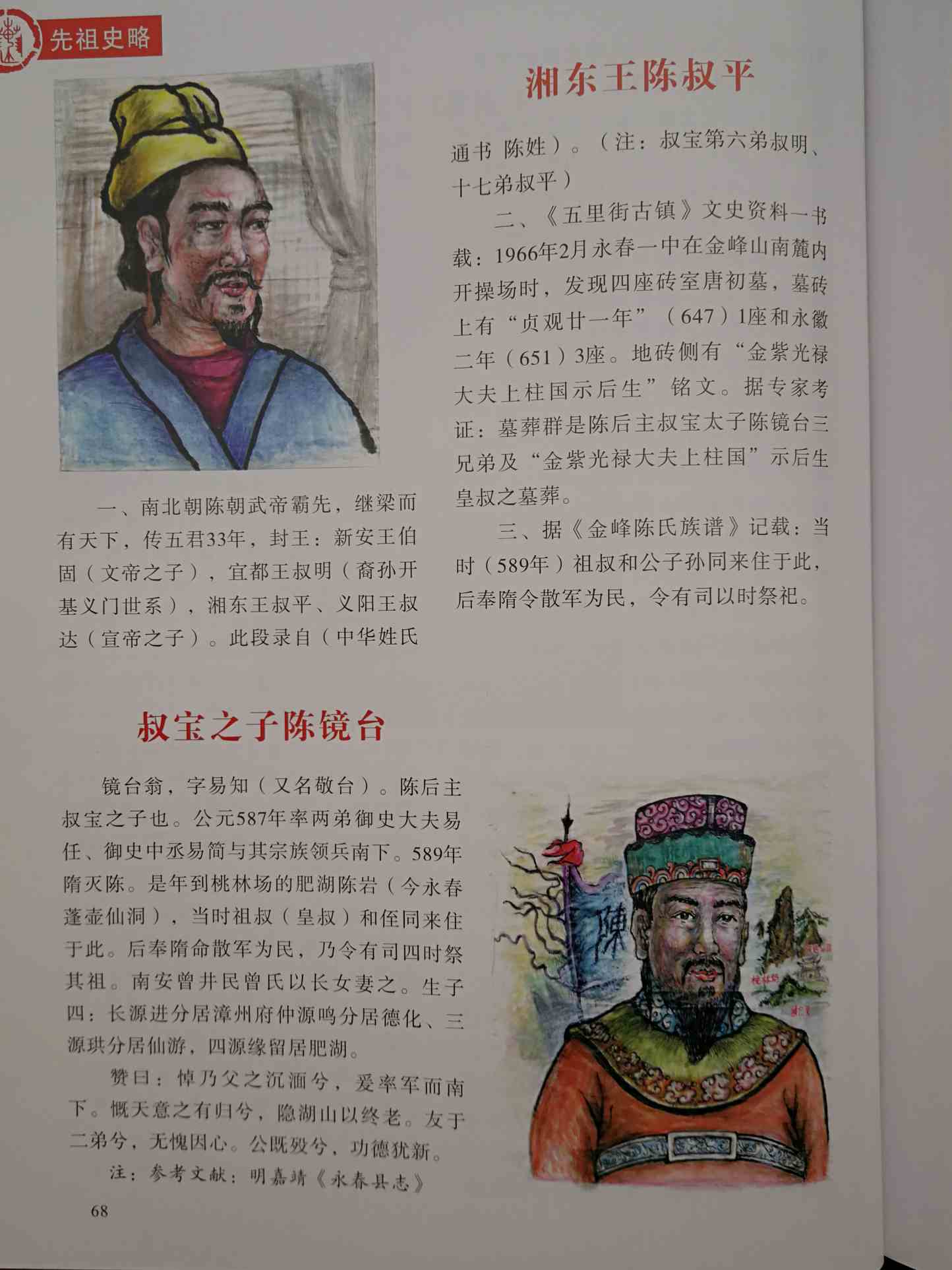 4,南郡王叔澄公后裔在福建的繁衍概况。宣帝第25子南郡王叔澄,入隋,大业中为灵武令,生子二:砚、礎。元末农民起义军首领陈友谅(叔澄公第12世孙宋宰相尧佐公之第13世孙),兵败,其族人为避祸迁金门,初居后浦,后移埔后,分支洋山。四川谱载,友谅同宗兄弟友定,历任元朝延平路总管、福建平章政事,迁福清,传至12世孙谷遂、克礼因兵乱由延平逃至福清高巷头玉涧,后迁龙江后坑,繁衍22代1000余人。外迁福鼎鱼井坑中,福清城关及广东海丰甲子所等地。友定公后裔原泮、爵一(振溪之子)由永春迁安溪县金谷镇东溪肇基。南郡王叔澄公9世孙廷霄迁霞浦长溪赤岸,后裔景仁迁南安市武荣南浦、石井苏内,丰州铺顶,福清港头、同安深青、兴化等地,后裔秀一、秀二迁顺昌郑坊。据浙江乐清翁垟陈氏族谱记载:叔澄九世孙廷宵公任闽行营兵马使,避乱居长溪赤岸(即今福建宁德市霞浦县擢秀里),为一世始祖,以下世系为:廷宵-准道-昭文-瀚公-禄-玑-必恭-仕尧-居仁-亨仲-康伯-安节-友兼。行辈:隆景福存仓继世友良应文德丕承方传家永余庆通国启恩光熙朝尚公正以仁必大昌康乐乃天定《康伯公年谱》。二世准道公字正平,后周时封行营留守;三世昭文公后周为国子监博士通判信州,迁江西广信府戈阳县孝诚乡(今戈江镇)居住;四世瀚公号淡斋行洪一;五世禄;六世玑;七世必恭;八世仕尧;九世居仁;十世亨仲;十一世康伯,字长卿,登宣和三年(1121)进士封二朝宰相,宋乾道元年敕赐旨牌"旌忠显德";十二世安节;十三世友兼号后山,字思爱,明代随父宧游乐清卜居西雁塔里为翁垟始祖。据南安石井武荣《南浦陈氏族谱》载:南浦始祖是南宋尚書左僕射贈太師陳康伯之孫,賜同進仕國子祭酒陳安節之子,國子助教陳景仁字永寿。景仁公于慶元四年與奸臣韓托胄相忤而避惹入閩。據族譜記載,玉公字良珍,唐河南開封府節度使,生子二:耿,光。光字漢清,王审知入閩時為左馮翊,子名鎮,字克昌,為江口巡檢,子名建定,字邦榮。邦榮生亨仲。亨仲生康伯(字仲卿),為南宋名相,生二子,偉節,安節。偉節生二子:景懷,景思。安節公為國子祭酒,生景仁,字永壽,為我南安武榮一世祖,二世允迪,字章典。三世宗源,字範睿。四世繩武,字仕隆。五世欽良,字秉彝。六世均肅,字政敷,生子四:文顯(迁同安东兴里深青),文明(迁福清港头镇),文節(迁兴化),文儀(居武荣,今泉州丰州)。七世文儀,字德宜,號建齋,生二男:長元庚字資白,次元會字資同號勳齋,八世元會為南浦開基祖,生三男:應,麟,熊。九世熊字孔望,生二子:習,得。十世習字廣悅,號易齋,生四男:仙應,佛應,天士,夏生。夏生字世亨,因葬土橋而稱土橋公,……自景仁公一世字輩“永”字開始,字輩排序:永彰範仕,秉政德資,孔廣世體,伯宏叔甫,爾念及祖,志學溥章,詒宗奕茂,華國揚廷 。明永乐14年(1416年)陈广悦为粮税官,定居海山庄今苏内,其后裔人口约1000户4000多人,武荣支派目前在闽繁衍后裔万余人。其中第16世储璋、储璞迁台湾,储壁、储瑆迁广东佛山。子孙后代在台湾、广东、浙江等省及东南亚发展,成为闽南陈氏望族。