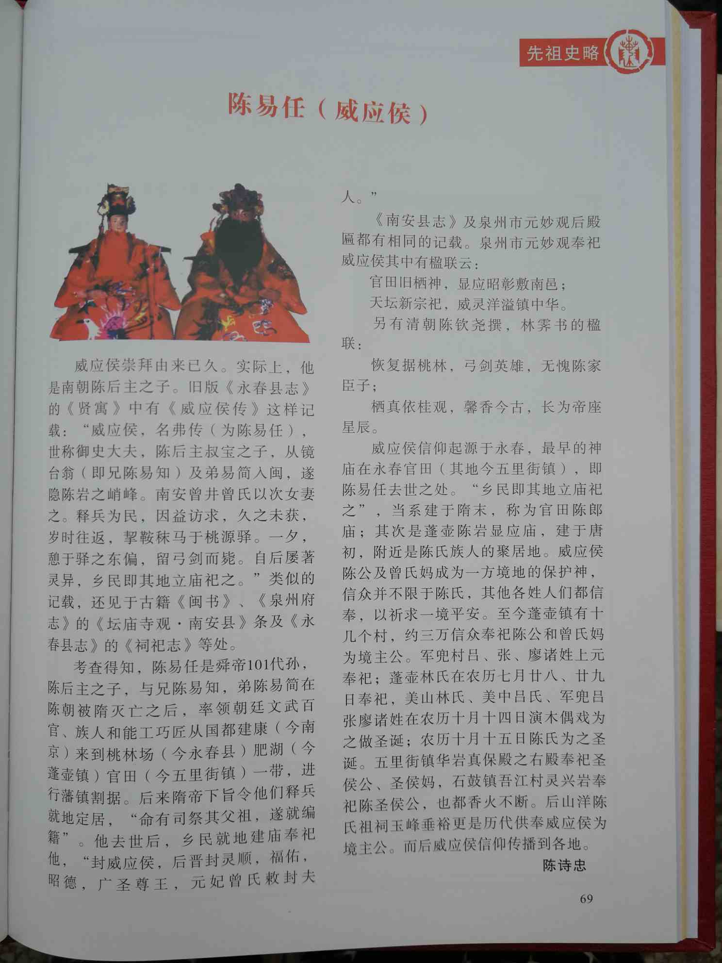 1,后主叔宝公后裔在福建的繁衍概况。宣帝长子后主叔宝之子会稽王庄公、东阳王佺公后裔迁霞浦,叔宝公之子元真后裔继陵迁宁德;叔宝公之子易知、易任、易简迁永春逢壶,形成玉峰、金峰陈氏望族。祯明三年(公元589),隋灭陈。南朝陈国宣帝昙顼长子陈后主叔宝公的三个儿子名:易知(也称镜台、敬台)、易任(御史大夫、威应侯)、易简(中丞公)一起率家族和部属南奔,于桃林场肥湖(又名毗湖)陈岩山(今蓬壶仙洞)定居。南安曾井曾氏以长女适镜台公、次女适易任公、三女适易简公。三兄弟为永春开基始祖。隋文帝,令陈氏皇族“释兵为民”,乃命有司四时祭其祖。易任雄猛,长征南越,大击丑虏,退于唐季,时为豪杰,功业甚著,不服旨令,避禄辞荣,乃领兵岁时往还,因益访求,久之未获。击鞍秣马憩于驿之东偏,乃留弓剑,一夕被毙。乡民即其地立庙祀之。庙名曰:“显应庙”(蓬壶真宝殿前身)。随族人迁徙今存华岩真宝殿右边的“圣侯公,圣侯妈”。金陵禾黍之悲(易任一夕被毙)。易简抱器而遁,散兵为民,卜据廿三都慕仁里溪西(今石鼓镇、五里街镇)活动以照顾在永子侄。其部分族人分散各地。镜台长子进居漳州府龙岩县,次子鸣居德化,三子珙居仙游,四子缘居肥湖(今蓬壶)。尔后六百余年间,陈姓蕃衍,分支泉南各地,亦有回迁永春。至宋,陈氏皇族极盛。南宋景炎二年(1277年),陈氏自以世代为宋臣,举族起兵勤王,并发兵抗元。后兵败,殉义者不计其数,陈氏皇族遭灭顶之灾,族人星散。易简公后裔永山公於宋末迁居东关莲内、百四又名掌仪公迁居廿三都慕仁里溪西,后定居五里街店前;易任公后裔知柔公裔孙逃往澎湖;易知公后裔、“百房分派”的陈光于宋绍兴年间迁居廿二都之魁塔池边拓基,卜居於魁塔,繁衍成魁塔、嵩魁派。幸存者在极其艰难环境中度日。而后,随着时光的流逝,各宗支又逐渐兴旺起来。易简公支派十三世裔孙有以数字为名的习惯。如廿二公子三:百一、百二、百三;廿三公子二:二百、四百;廿八公子三:百四、百七、百九。盛时年曾百对新人结婚,有“陈百房”之美誉。自绍圣四年(1097年)彦圣公起数代科举不断,绍兴十二年(1142年)知柔公(号休斋字体仁)中进士第四名,成为大理学家。同代著名理学家朱熹与之来往密切,并为陈氏族谱撰写谱序,赞为“三四乡贤”、“一门八俊士”。1923年春,闽南各地陈氏族裔捐资修葺泉州元妙观后殿东畔,以崇祀祖神威应侯。保存上述纪念册的是桃城镇丰山村陈玉裁,其族奉“御史大夫”为始祖,实属陈易任派裔。明代从呈祥乡东溪村(古称当魁)迁往安溪县湖头镇和金谷镇的陈姓源源数万人丁,与今居东溪的陈姓是同一支派(易知公派),每年一次会合,共拜祖祠,共敬境主公威应侯神。迁居金门县金沙镇斗门里之族裔,回故乡与族亲修缮知柔墓、新造怀古亭。