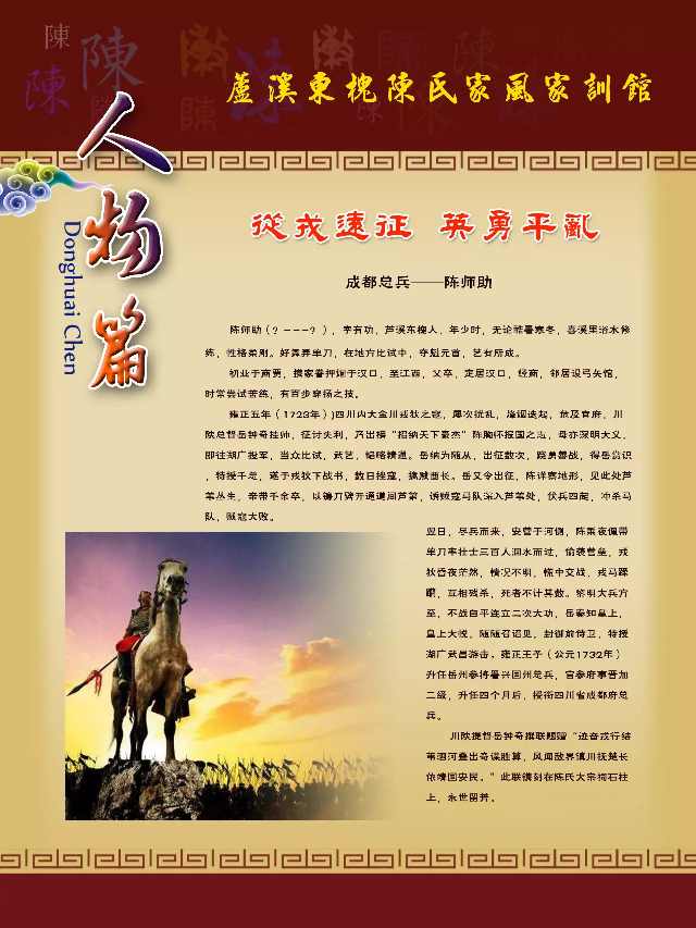 清"从戎远征,勇猛平乱"的四川成都总兵陈师助(平和芦溪籍);清乾隆年间两袖清风、勤政为民的明通进士陈先声(平和芦溪籍);清嘉庆年间国子监琉球教习陈锦湖(永定籍),等等。为国家的发展与民族的振兴作出了巨大贡献,书写了永垂不朽的历史篇章。