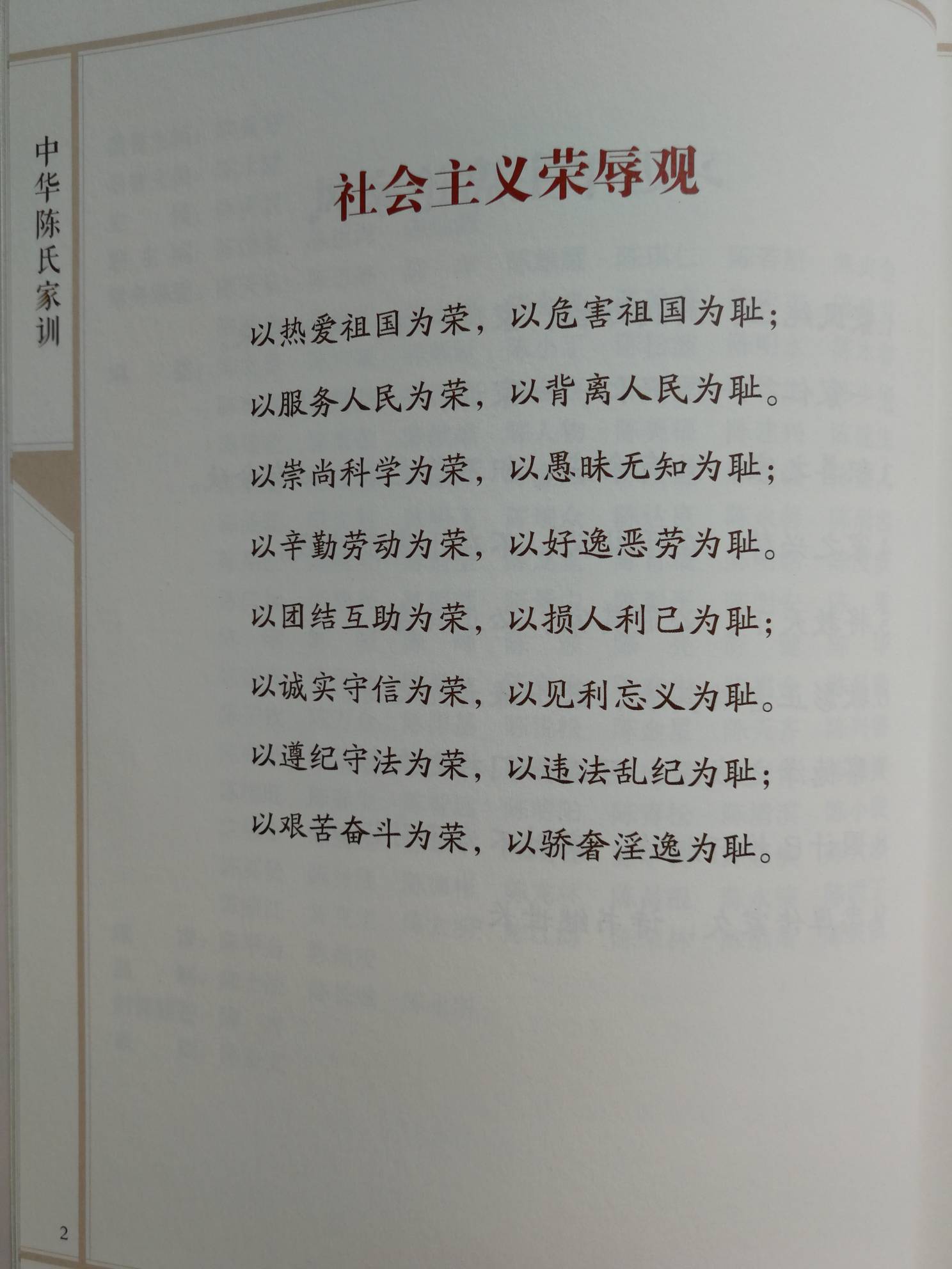 以热爱家族为荣; 以损害家族为耻。以服务家族为荣; 以背离家族为耻。 以诚实守信为荣; 以见利忘义为耻。以团结互助为荣; 以损人利己为耻。 以勤奋努力为荣; 以不思进取为耻。 以积极主动为荣; 以消极被动为耻。 以知恩感恩为荣; 以忘恩负义为耻。以大爱无私为荣; 以自私耍心机为耻。以传播正能量为荣; 以传播负能量为耻。 以遵守家族制度为荣; 以违背家族制度为耻。以保护家族利益为荣; 以背叛家族利益为耻。陈氏家族精神:勤奋、专注、自强不息。团结互助,扬我陈氏家族雄风!陈氏家族作风:信守承诺 !陈氏家族事业:成就大业之心,成为家族荣耀!陈氏家族:家族至上,个人退后!感 恩:以感恩为荣,以忘恩为耻!忠 诚:以忠诚家族、忠诚长辈、忠诚、忠诚、绝对忠诚为荣;以背信弃义、奸侫小人为耻。