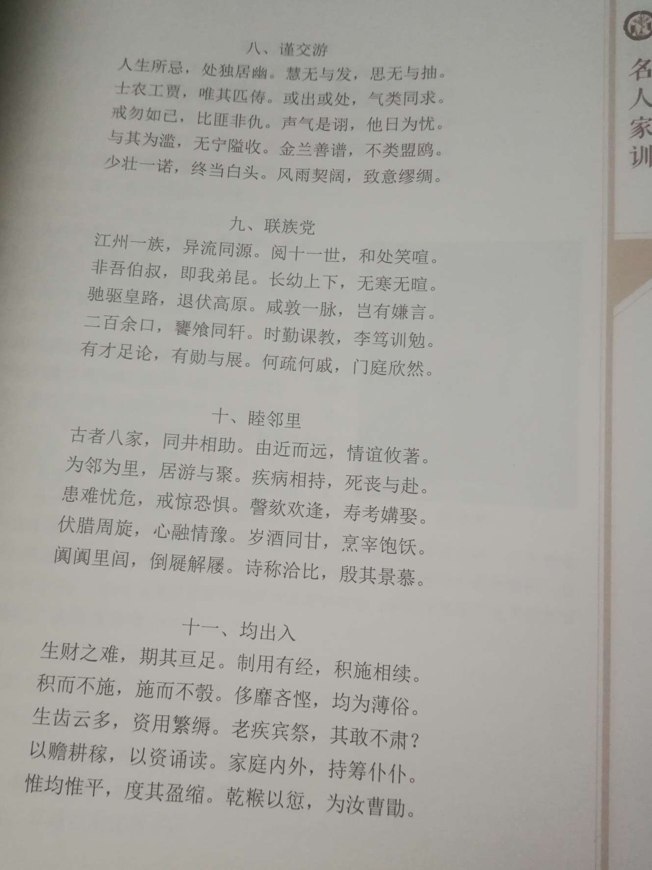 十二、睦宗族:祖先虽远,不忘秋霜春露之诚;子姓同源,当念收族敬宗之义。在昔邦族既有专官,乡党亦隆宗法。所望克承古谊,垂裕后昆。序齿辨贤,有教惠我子弟;型仁讲让,无怨恫于先人。忧乐相关,有无相恤。萃太和之象,光照宗枋;敦雍睦之风,远承祖武。庶我义门矩矱,自始如新。敢告吾宗,敬之毋忽。
