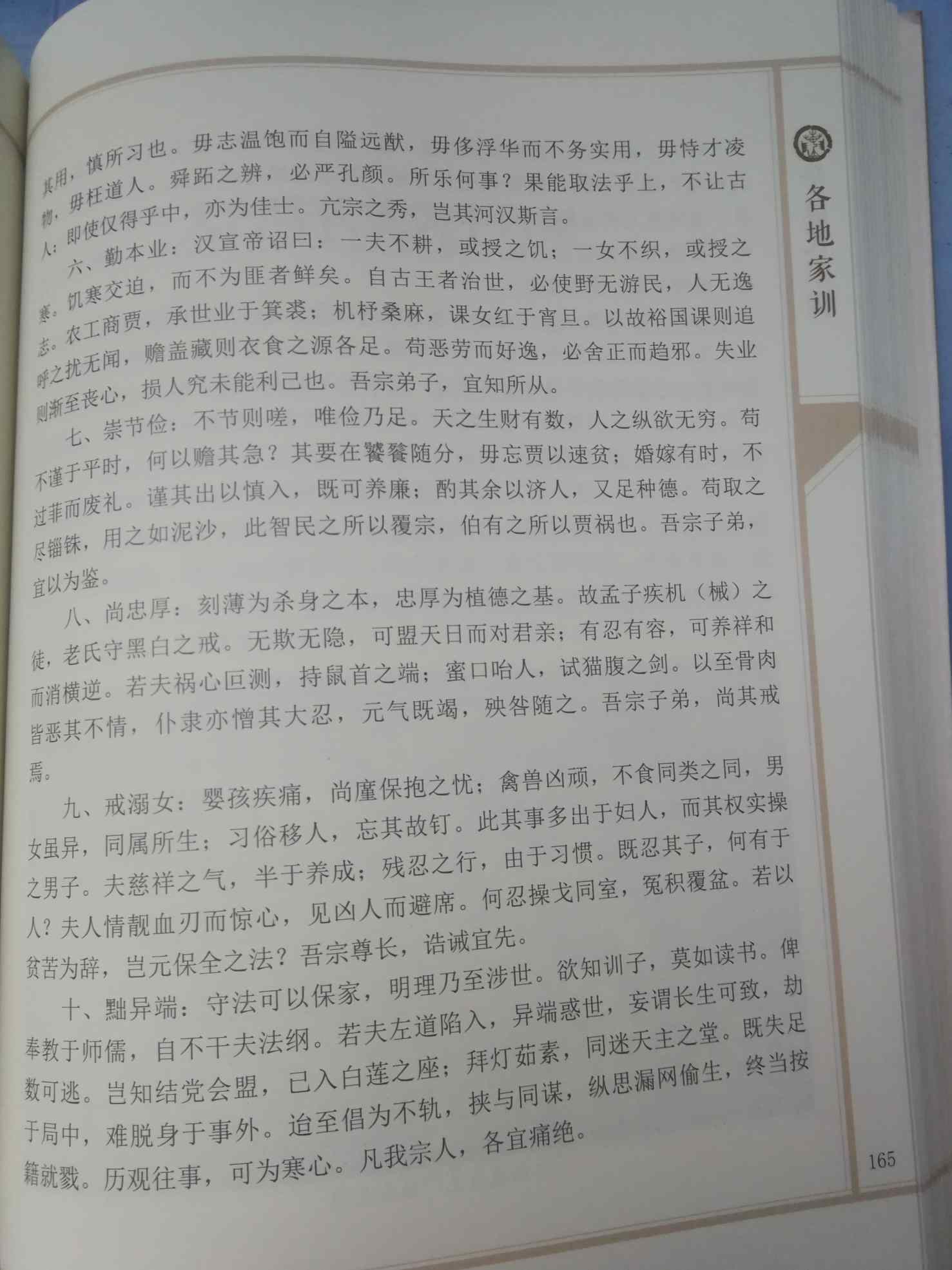六、勤本业:汉宣帝诏曰:一夫不耕,或授之饥;一女不织,或授之寒。饥寒交迫,而不为匪者鲜矣。自古王者治世,必使野无游民,人无逸志。农工商贾,承世业于箕裘;机杼桑麻,课女红于宵旦.以故裕国课则追呼之扰无闻,赡盖藏则衣食之源各足。苟恶劳而好逸,必舍正而趋邪。失业则渐至丧心,损人究未能利已也。吾宗弟子,宜知所从。