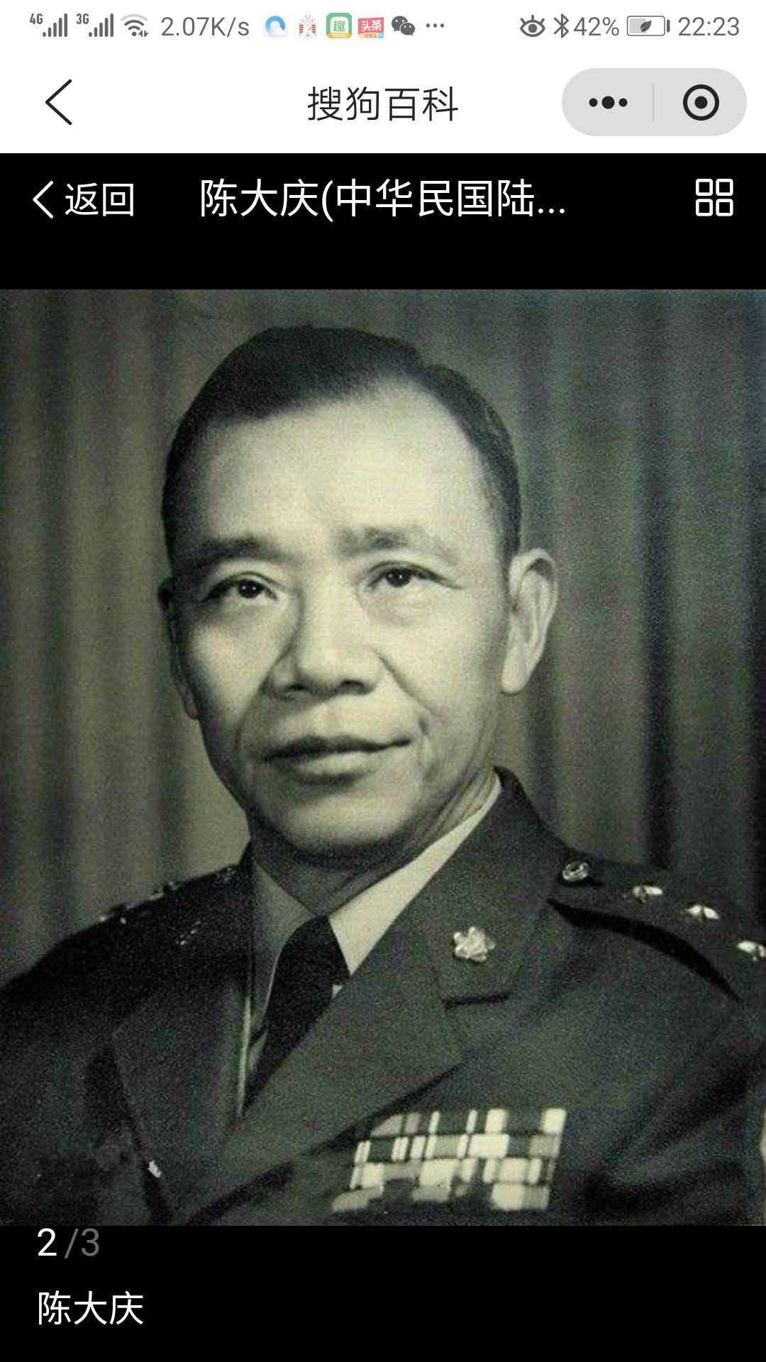 陈将军,江西祟义人,1903年生。是黄埔军官学校第一期毕业。自东征、北伐、剿匪,由排、连、营长,积功升团、旅长。抗战军兴,任第4师师长,调58军副军长,升新编第2军军长,旋改编为第29军军长,调19集团军副总司令,1933年,升19集团中将总司令。胜利后,任第一缓靖区副司令官,翌年,调南京卫戌副司令官,1937年调衢州绥署副主任,旋调京沪杭警备副总司令、兼淞沪警备司令。1943年出任国家安全局副局长,继掌国家安全局,1949年晋升陆军二级上将。1951年11月,调任台湾警备总司令、兼军管区司令。将军于1956年调任陆军总司令,嗣膺任台湾省政府主席,国防部长。