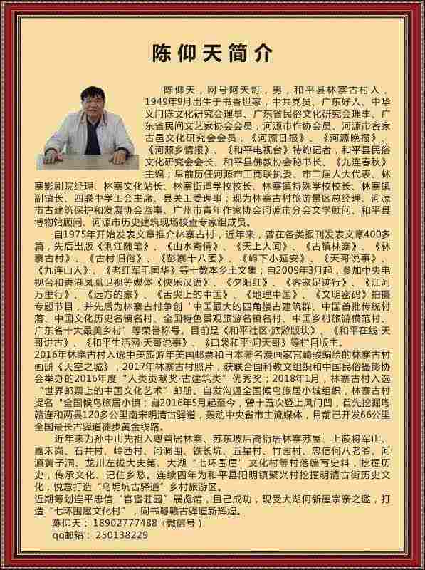 陈仰天,网号阿天哥,男,广东省和平县林寨古村人,1949年9月岀生于书香门第义门世家,中共党员。林寨元坤公第23代裔孙。全国百姓学习之星、广东好人、中华义门陈文化研究会理事、广东省民俗文化研究会理事、广东省民间文艺家协会会员,河源市作协会员、河源市客家古邑文化研究会会员,河源市摄影家协会理事、河源市周易文化研究会副秘书长、《河源日报》、《河源晚报》、《河源乡情报》、《和平电视台》特约记者,和平县民俗文化研究会会长、和平县佛教协会秘书长、《九连春秋》主编;早前历任河源市工商联执委、市二届人大代表、林寨影剧院经理、林寨文化站长、林寨街道学校校长、林寨镇特殊学校校长、林寨镇副镇长、四联中学工会主席、县关工委理事;现为林寨古村旅游景区总经理、河源市古建筑保护和发展协会监事、和平县博物馆顾问、河源市历史建筑现场核查专家组成员。