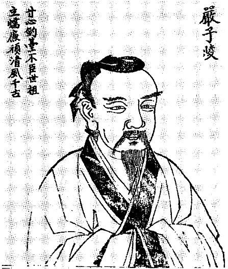 严光像,图出自明·天然撰《历代古人像赞》。严光,字子陵,是汉光武帝刘秀的老同学。本姓庄,因避汉明帝刘庄讳而改姓严。