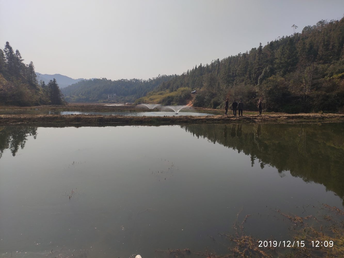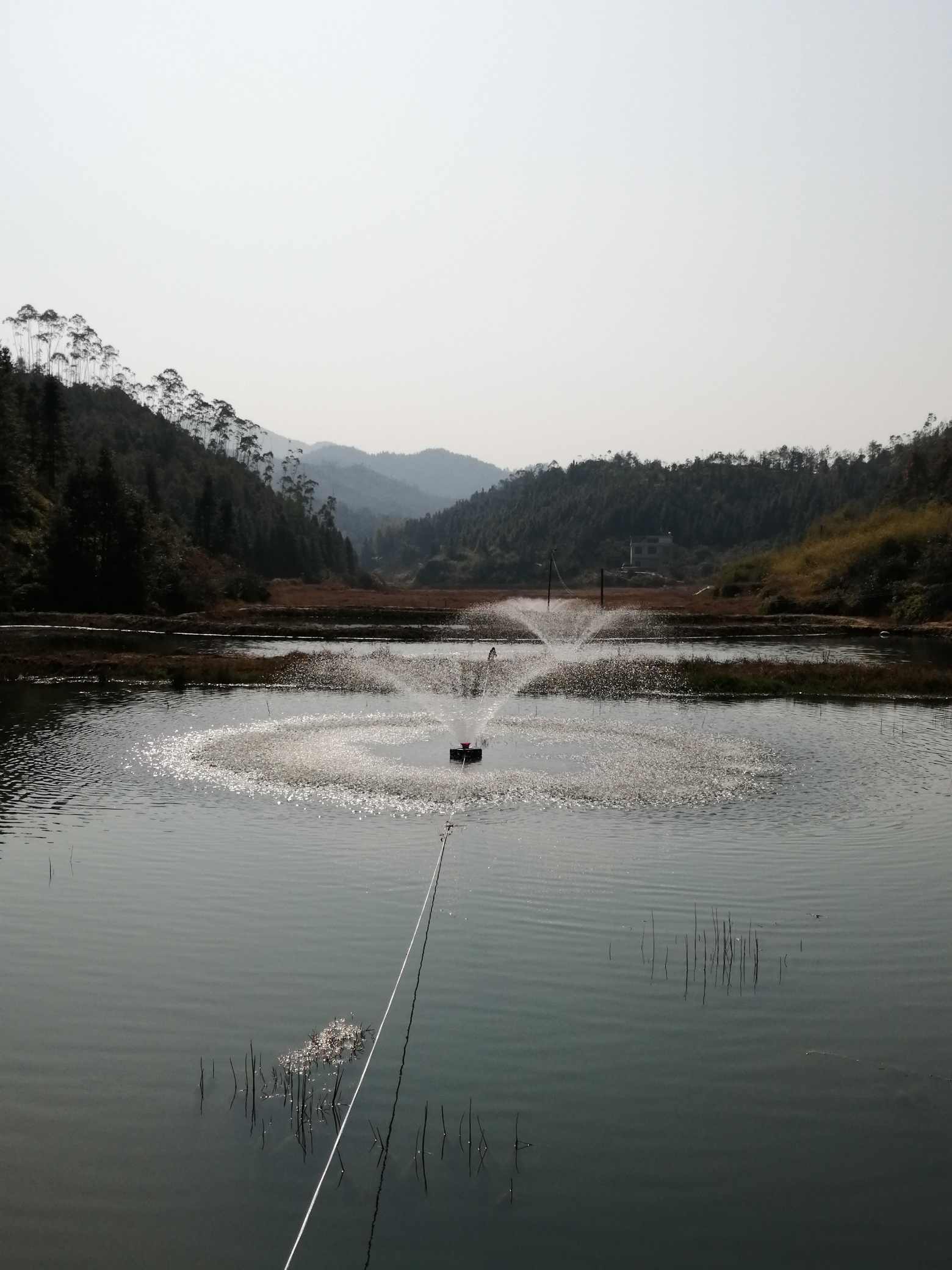△图为鱼塘增氧机正在为鱼塘增氧。