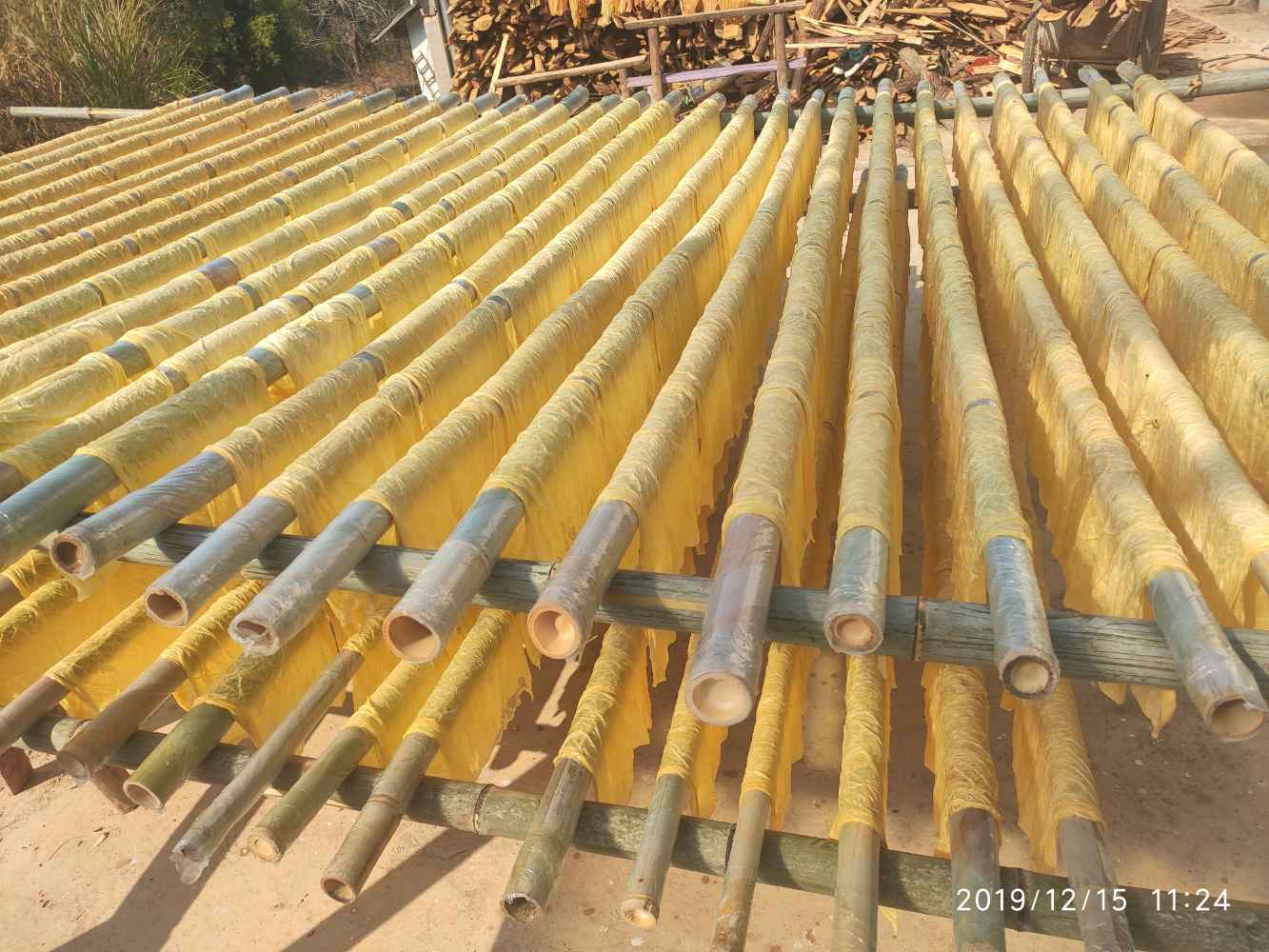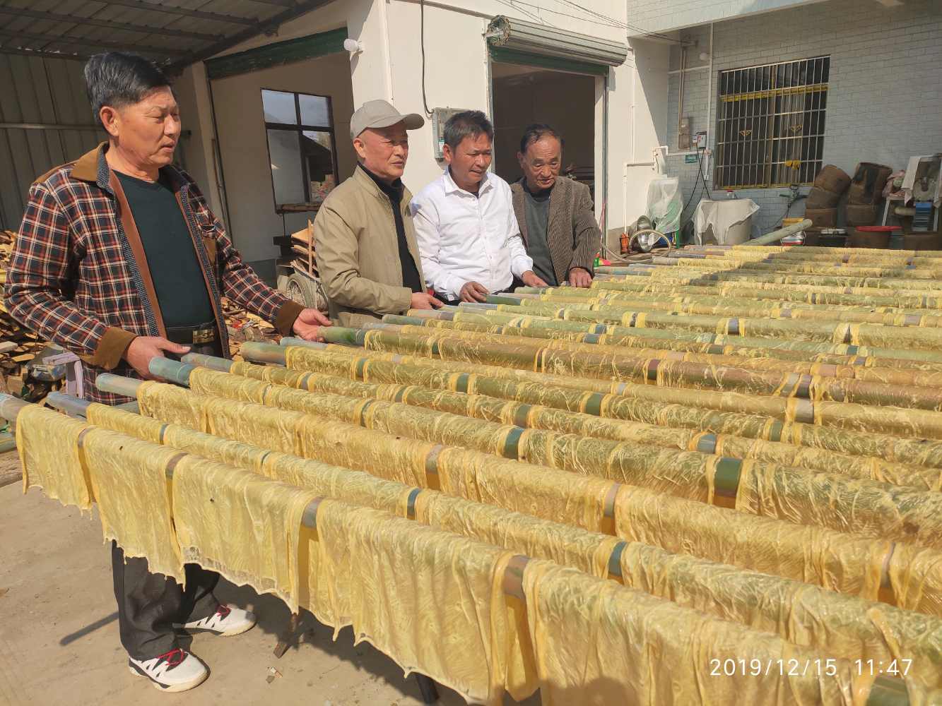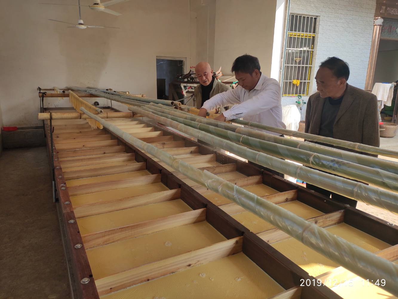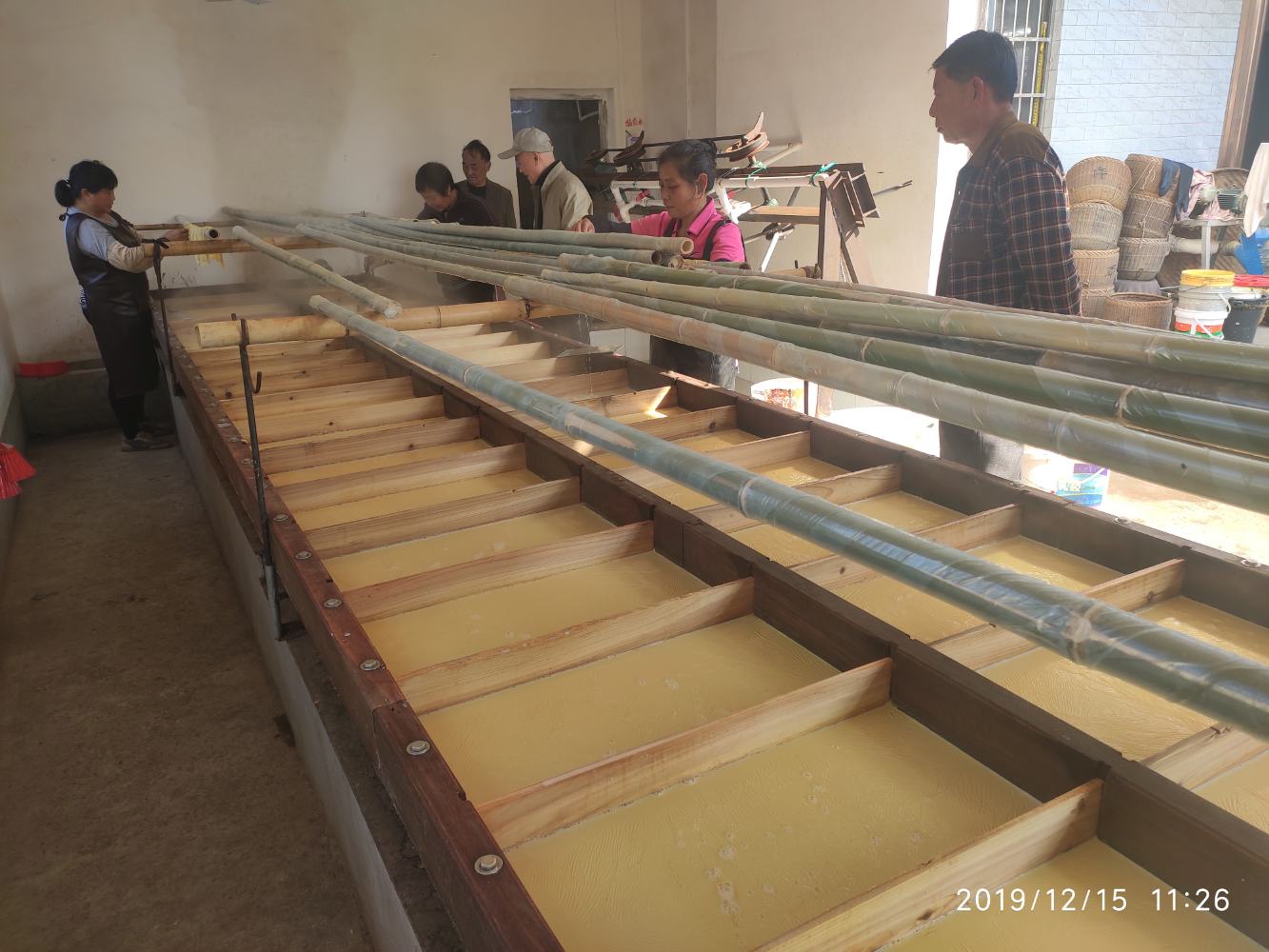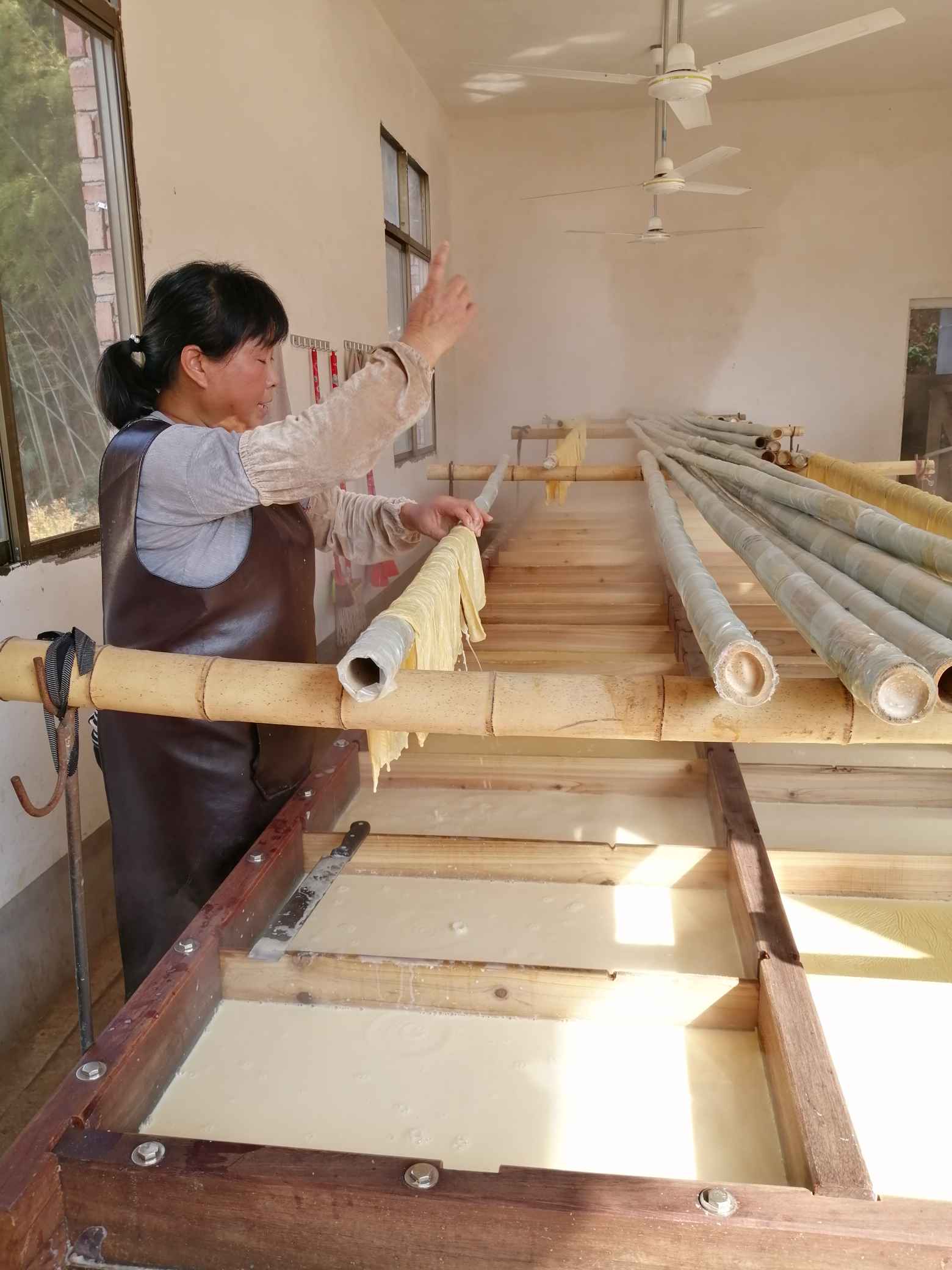 △腐竹厂员工正在精心收割腐竹皮。