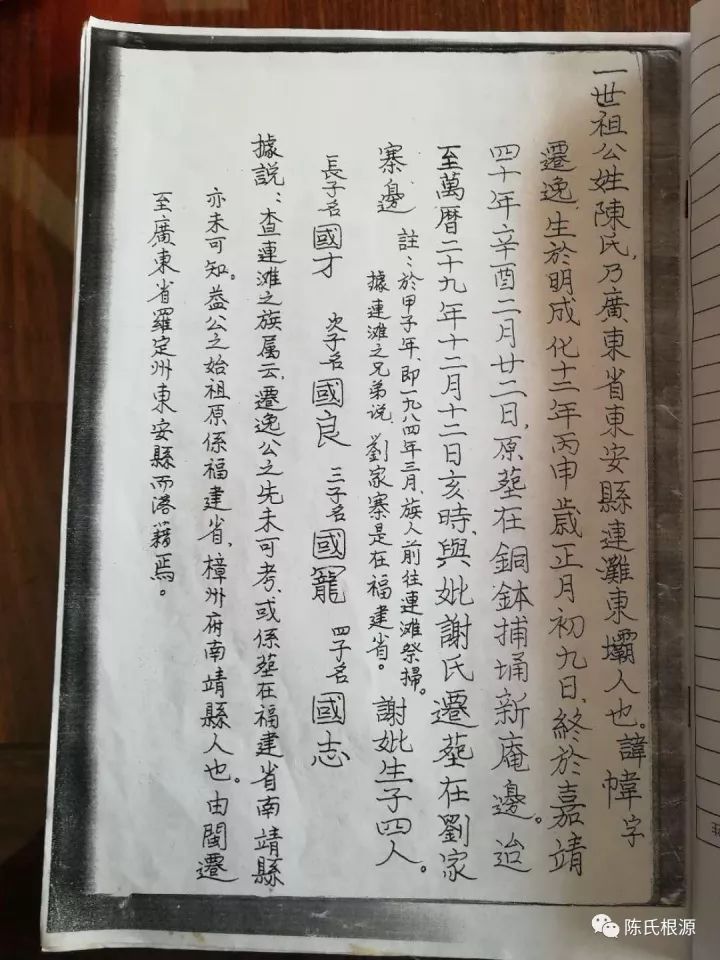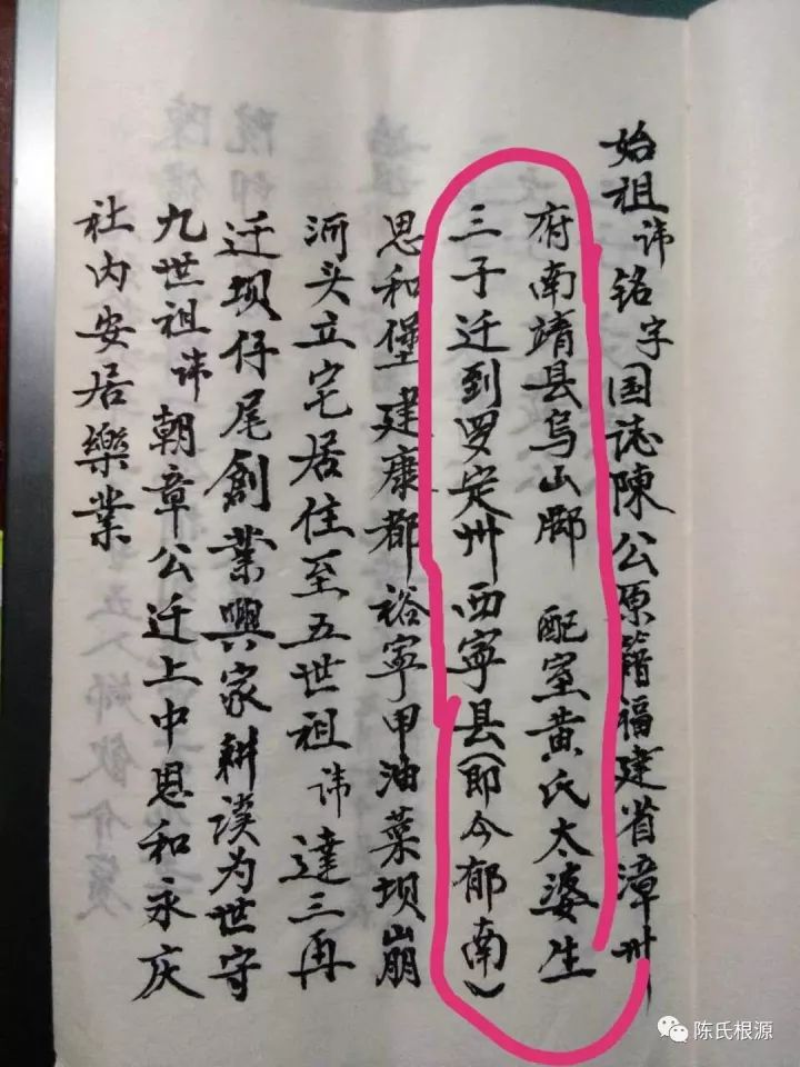 我福建始祖陈迁逸娶谢氏生四子,长子国材、次子国良、三子国志、四子国罷,后迁移广东郁南县连滩东西两坝后,他们四弟兄又结婚生仔繁育后代,而三弟国志公还生六仔后又带最小的那个儿子回到福建与父(陈迁逸)母(谢氏)定居生活直到本人陪父母在福建漳州府南靖县雷公寨卒逝为止,而他的三个哥弟…国材、国良、国罷及国志公五仔则还在广东郁南县连滩东西两坝繁育后代创基立业后,他们的子孙又大部分迁移广西玉林、柳州、桂林、桂平、平南、藤县、北流等地,同迁逸公根系后裔到现在为止已有二十世传了,总人口十万左右,我迁逸公(成化十二年即1476一1477年)历经到今年刚好540年,在这么短的时间发展这么庞大的后裔,连福建我们派系的祖宗都找不到,这次我们两广迁逸公后裔分派九人寻根问祖代表团到福建寻根问祖,在福建每到各村场及市镇都得到了我们的兄弟大力帮助和支持,减去了很多不必要的麻烦,经历十二天的寻找,各村镇的房头族谱乃至县志都查了,还是找不到我们的福建支系祖宗,到底我们迁逸公在哪里?所以望在群的兄弟们麻烦帮留意下或转发其它兄弟群告知,兄弟一场拜托众兄弟了,如有信息,麻烦告知。