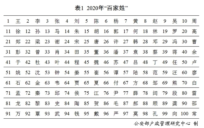 2021年2月8日,公安部发布《二〇二〇年全国姓名报告》。按户籍人口数量排名,2020年的“百家姓”与2019年相比变化不大。“王”“李”“张”“刘”“陈”依旧名列前五,五大姓氏人口总数占全国户籍总人口的30.8%。