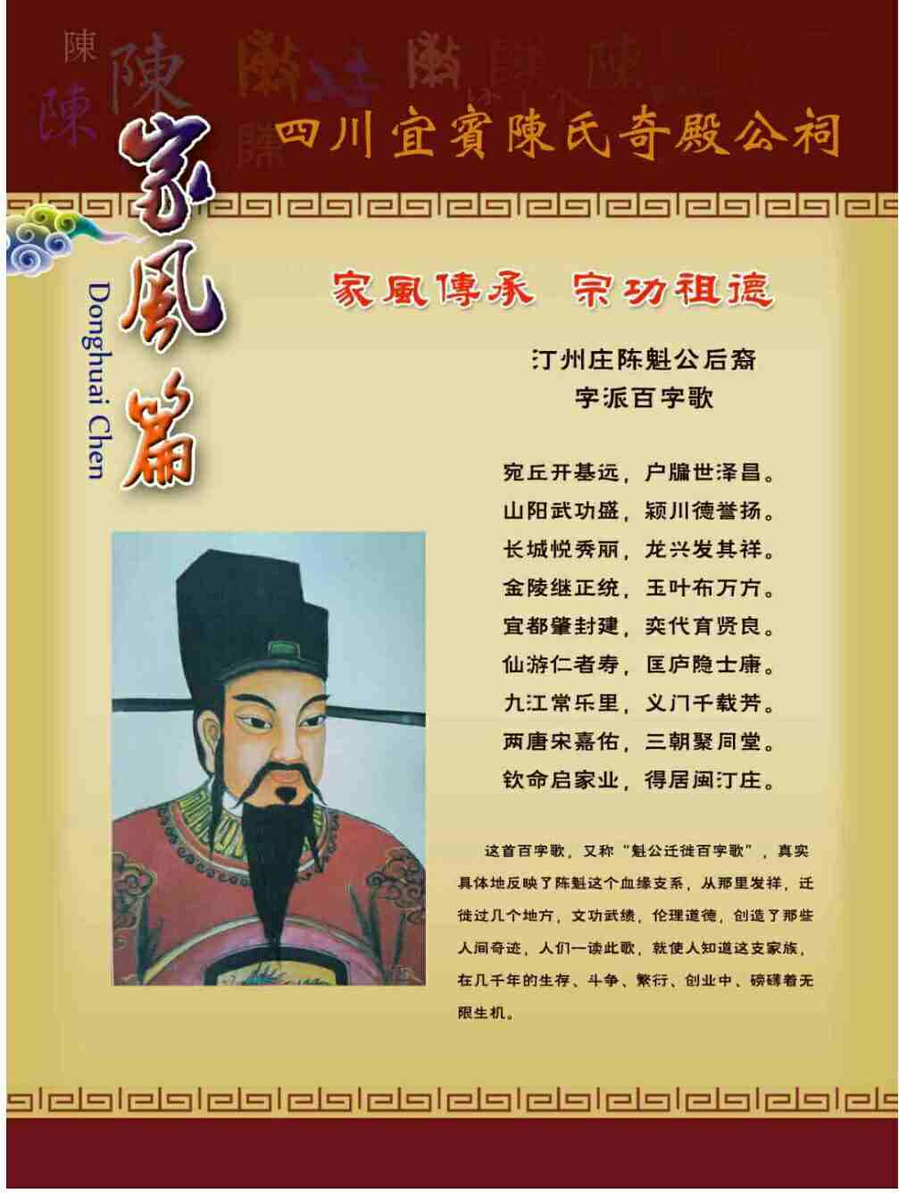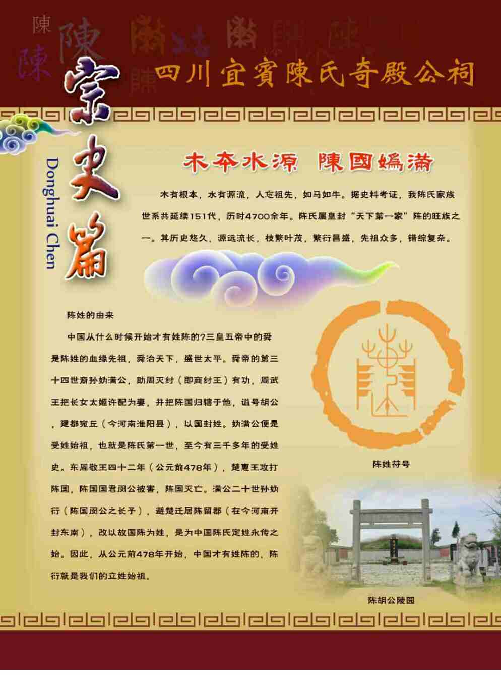 粤自重崋協帝,玄德升聞受命之初,奄有四海宗廟享之子孙。保之越夏及商至周武王,弔民伐罪。以安天下定鼎之後,始封三恪時,有胡公满者,係虞舜之後裔。故武王封胡公為陶正之官食邑,於河南陳州,因邑而受姓。而陳氏之姓於此始焉。厥後,陳敬仲奔齊,傳韶樂於齊。孔子周逰至齊,得聆韶樂心醉而神怡。春秋之陳亢封南顿候,戰國之陳臻受業孟氏,及秦氏之陳涉起發義兵,志比鴻鹄,善政善教,以德服人。漢之陳平輔佐炎帝,奇計六出,封為鄴都候。東漢之大邱令陳實子:元雲、元秀,孫:長文、孝先,三代盛德著聞,史記有二難之譽。文範聲名又封長文為太邱縣晉之陳羣先有司,而後有司空五代陳霸先受梁禪而登帝位,富有九有,為天下君延一十二世,有九江陳褒世德相承,千口同居食設廣席,鸣鐘而食。南唐旌其閭曰:德化義門良有以也。於是離畿索居羣萃州處各選省會。雖星居别省,文有科甲之魁名,武有品級之荣贈。諸公諱號未獲備錄,即以鼻祖一脉,如唐之尚書陳淑逹任傅臚職不避雷霆。宋之御史陳光佐相仁宗,陳執中相德宗,陳康伯鼎立朝綱而秉國鈞,陳同一陳藴籍俱編修翰林院,非所謂四表人傑,德業聞望者哉,初未嘗冒引以誇世,離本而沽名者也。傳至我始祖茂濂公为宋理宗副章使者,生七子:陳宗、陳炤、陳宗禮、陳伯玉俱受邊衛將職,陳冝中御擢狀元,厯相恭端二帝。陳文龍砥柱中流,自信節義文章,陳昌明才學兼優,授豫章太守,故當代美稱七贤。二世祖昌明公生四子名諱:龍江、龍湖、龍河、龍海。我三世祖龍海公始居南京南水縣分支分派一脉,傳流而星居别土,又各自编其譜,以宗其籍,將見朗朗雲祧,彰彰竹簡螽斯墊墊,孰非難弟難兄麟趾。振振胥皆公姓公族,俾我後人思義交畫禮法宣明,勿昧根本是為録之。