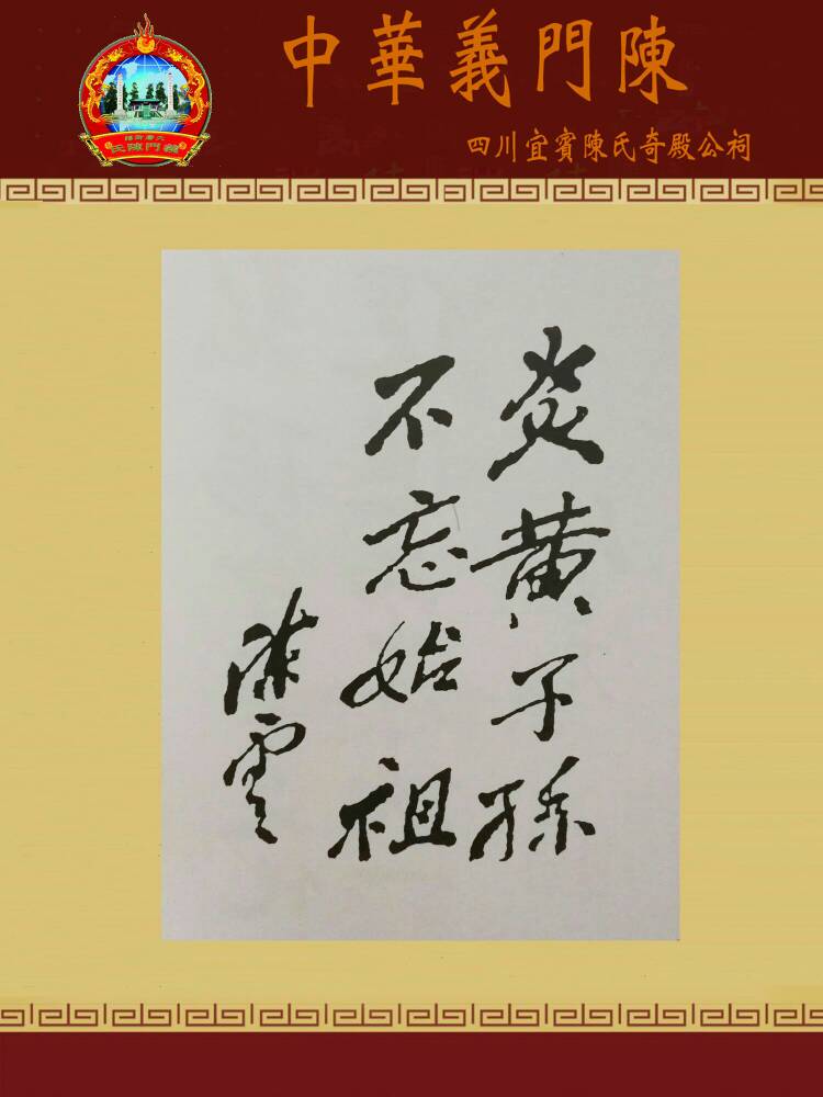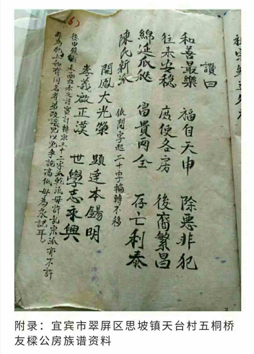 二十世祖陳公友先,妣古氏移居四叙州府宜宾縣水過河郷鱼嘴居住,生三子:日高(妣黄氏)、日炳(妣古氏)、日海(妣黄氏),友先公葬於水過河郷陳家坡子山午向,妣古氏葬于水過河郷塘坡。
