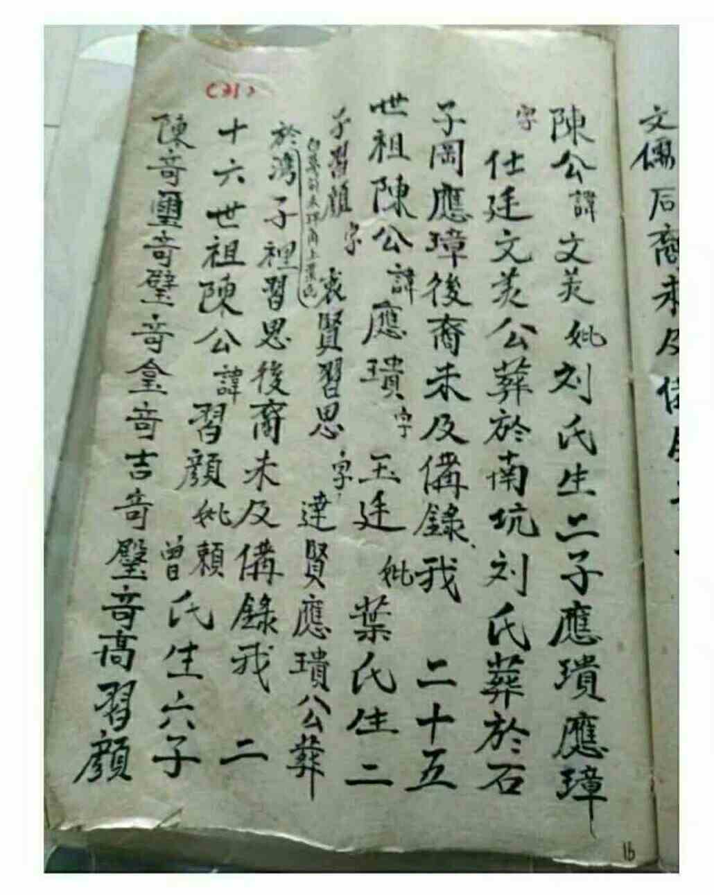 我十五世祖陳公諱文美,妣劉氏生二子:陳應璝、陳應璋(字,陳仕廷),文美公葬於南坑,妣劉氏葬於石子岡,應璋後裔未及備錄。