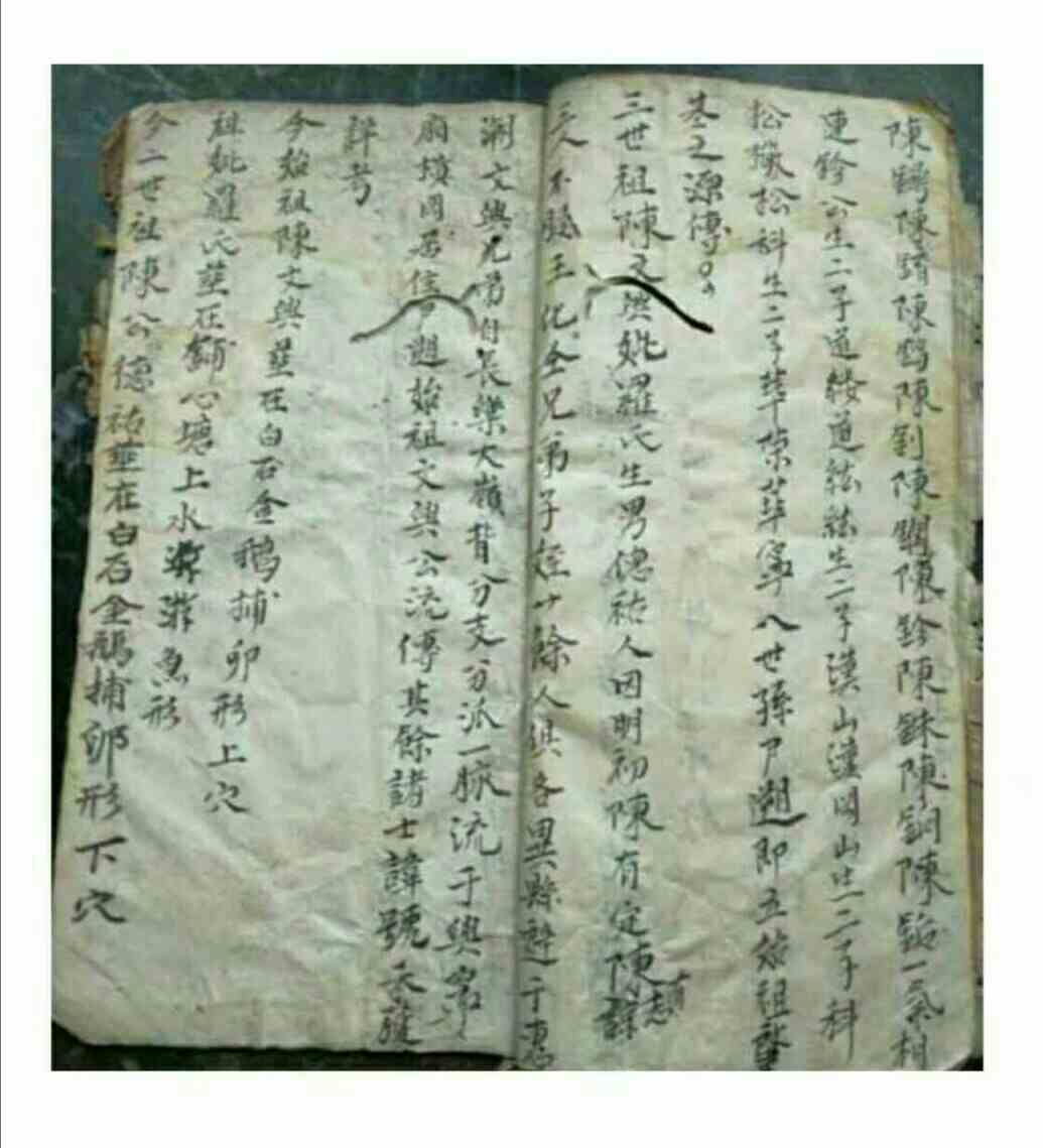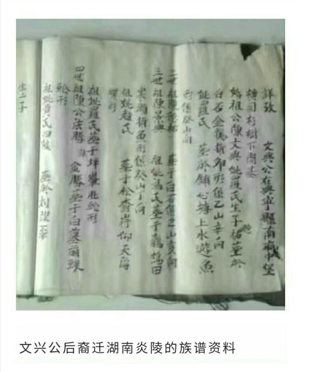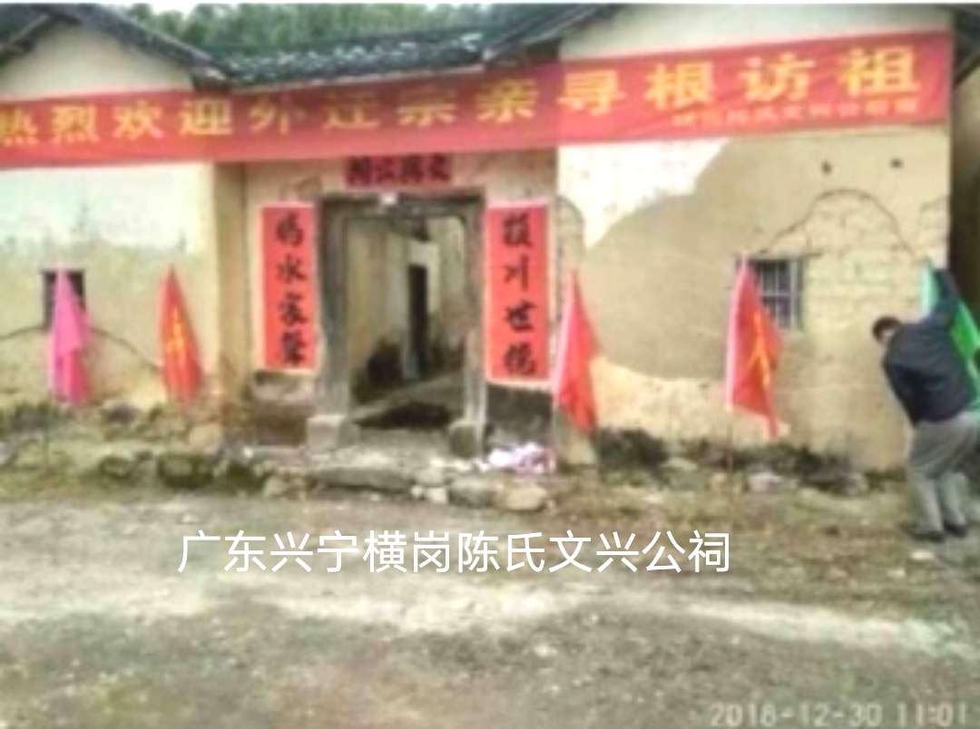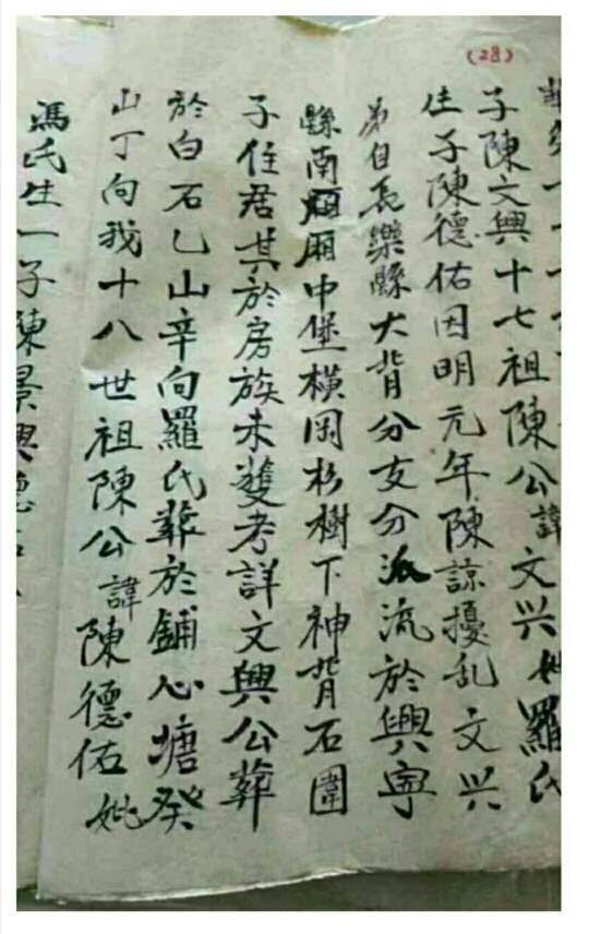 我八世祖陳公諱文興,妣羅氏生子德佑,因明元年,陳友諒擾亂,文興弟兄自長樂縣大背分支分派,流於興寕縣南厢中堡横岡杉樹下神背石圍子住,其餘房族未獲考詳,文興公葬於白石乙山辛向,妣羅氏葬於鋪心塘癸山丁向。