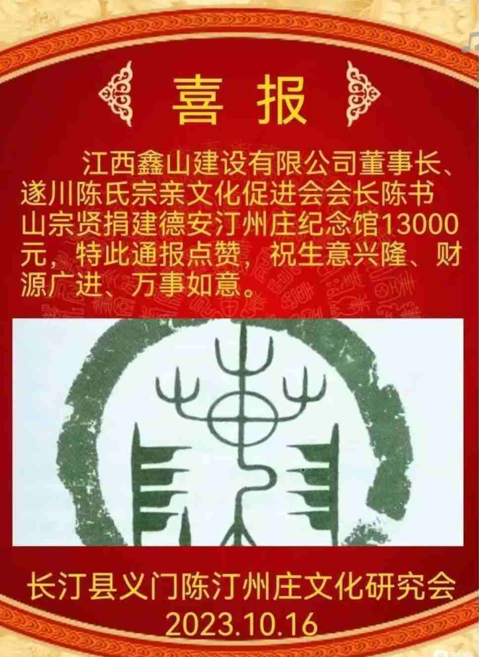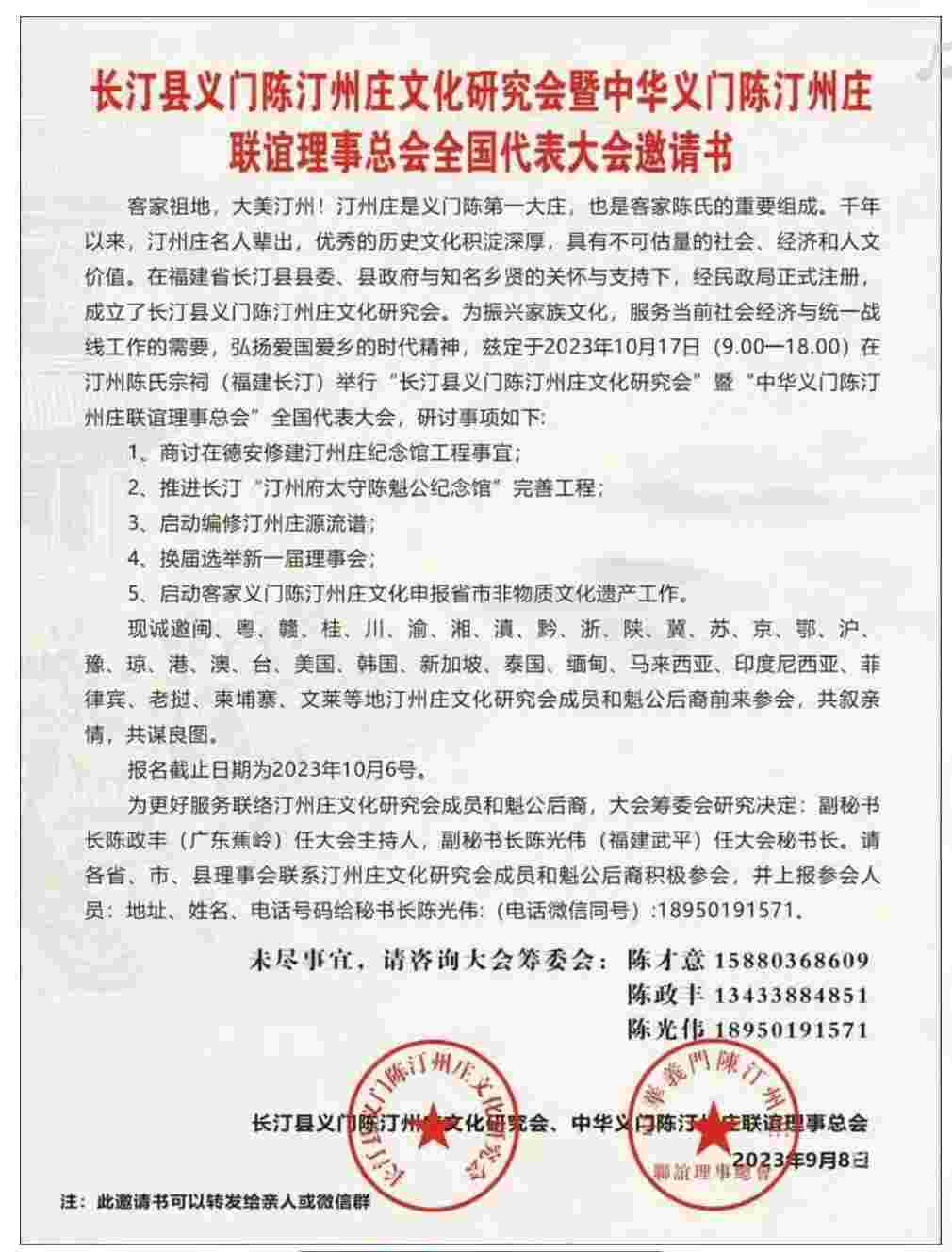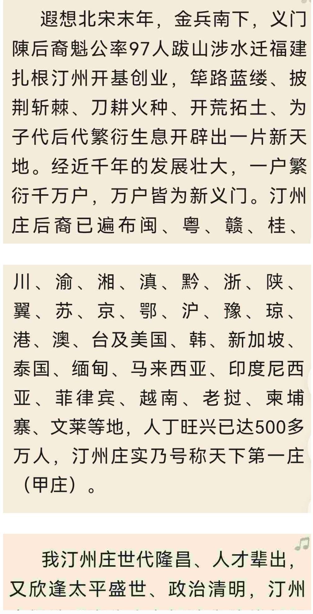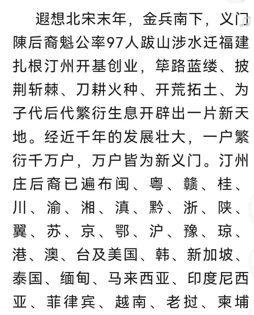附:据广东和平谱载:孟一郎妣郭氏生子振一郎,振一郎妣谢氏生子濂公(名广)字茂濂,宋翰林学士,为元龙副章使,妣张、杜氏生十八子:长康元、次康文、三康宇、龙、虎、义、正、太、伯、宁、建、仲、兴、明、达、远、盛、茂。介俊秀贤美,具有以文学孝廉名世。有七子三文四武,称“七贤林”,有康伯号俊玉字昌明,才学兼优,初任豫章(今南昌)太守后官居台谏。康伯公妣许、宋、常氏,生四子:长龙江、次龙湖、三龙河、四龙海。而江、湖、河三公,兄弟意志相合,各迁一方,立业于云南、贵州、西蜀三省。陵州兵马都尉,龙湖公妣邱、蔡、苏三宜人,迂回定居于广东陆丰县。惟龙海公创基立业于江南栗水县(江苏栗水县)妣朱氏生二子:长立常、次利常。我立常公元纪登进士,任粤镇府太守兼督粮司务,为官清廉。娶妻刘氏(翰林刘正连之女)生八子:长施、次铨、三铜、四敬、五桓、六衡、七步、八元。立常公次子铨字以仁,娶妻王氏生二子:长玉兰、次玉英,迁居江西临江府八十都上墩围九甲竹林立业。四子敬字以义,娶妻蔡氏生二子:长粮、次煌,迁广西、贵阳府、雨阳十八都。五子陈桓公字以礼,娶金氏生二子:长龙名虬字子文,次虎字子武。居江西泰和县,乡庆孝廉,又迁北京五风楼前军马司顺和街住,而龙公(子文)甲午(1294年)科举人。元天历循州(今属龙川、兴宁、和平、五华、连平等地)训导,升福建泉州太守。因元未红巾军蜂起,未得赴任,不得旋回原籍。知兴宁山清水秀,而择地定居,为兴宁开基祖。六子衡公字尧章;卒于江西龙南葬东水西掌牛坑,另一说葬福建猪姆带仔形壬山兼子。