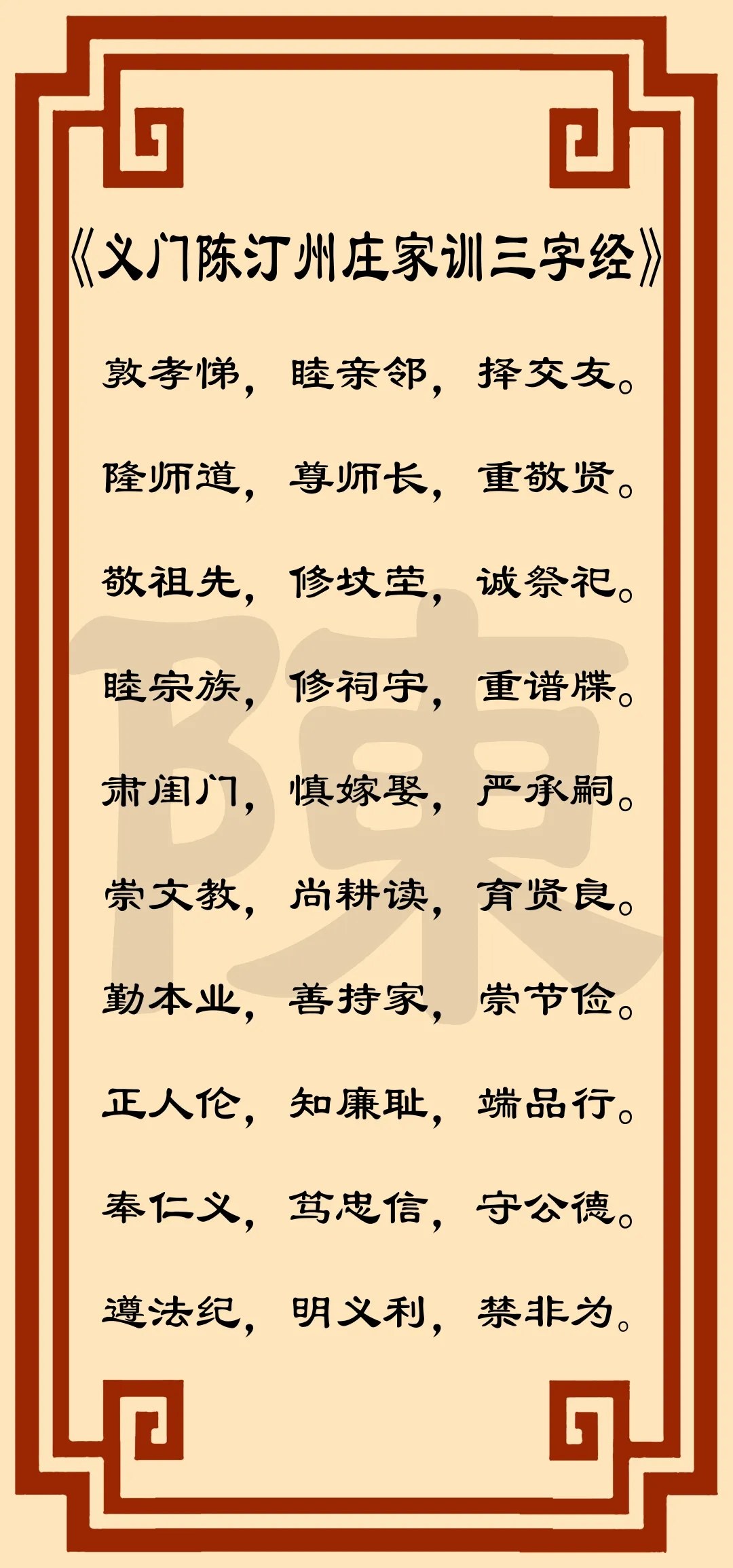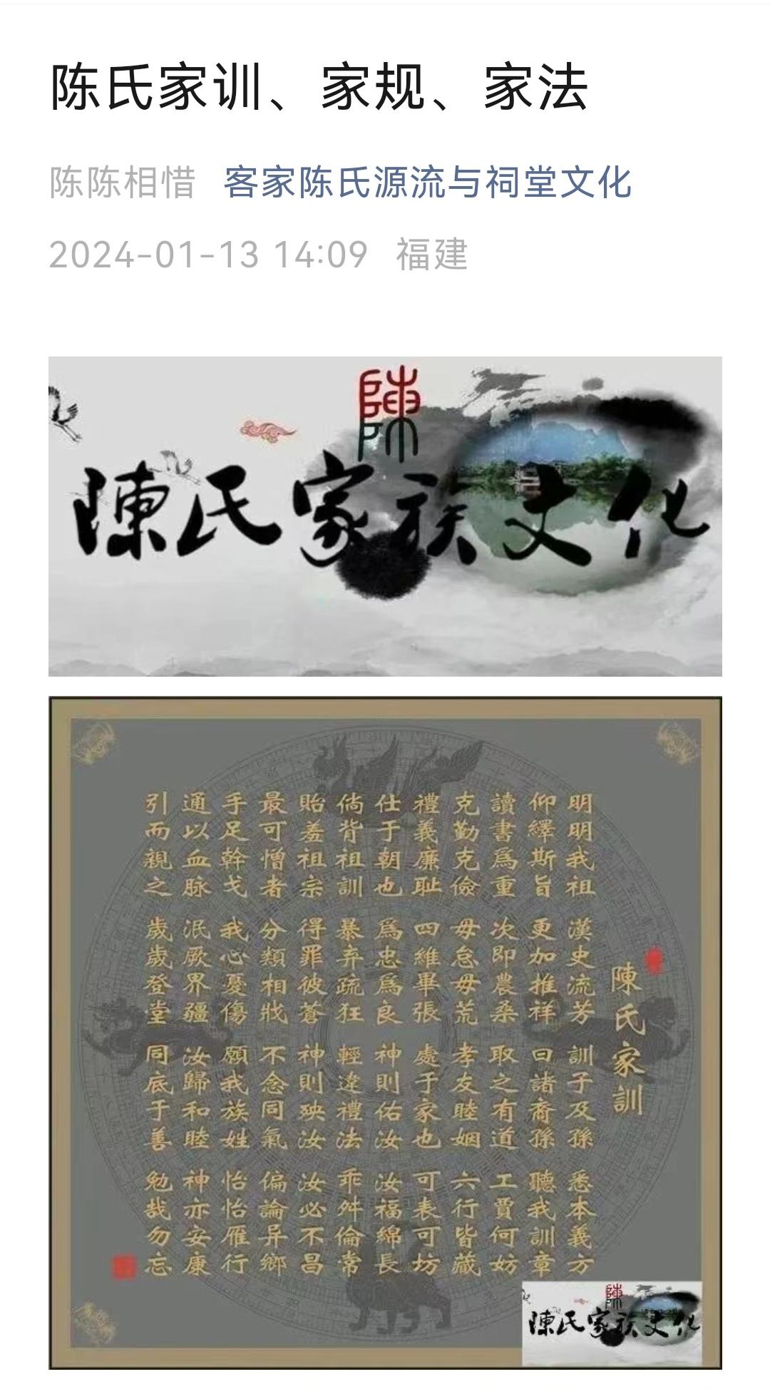 今日,笔者在研习客家移民文化时,有幸拜读了刊载于《客家陈氏源流与祠堂文化》微信公众平台的《陈氏家训、家规、家法》等文献资料,对陈氏家族的家训、家规和家法情况有所了解,为弘扬文化,传承文明,特以《家训家法家规强,家族文化大弘扬》为题,摘要转述如下。如有不当之处,望多批评指正!谢谢!