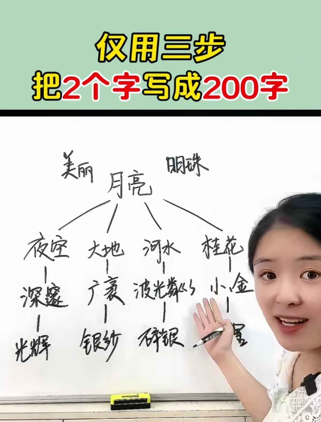 好,一写到月亮呢,很多同学就会写:弯弯的月亮像个船,或者是圆圆的月亮像个大圆盘,那,这样写的话,千篇一律,字数还少,就没什么特点了。我们要把两个字写成200字,就能把作文写长。语言不优美的同学,看如何写出一段非常优美的文字写出来。
