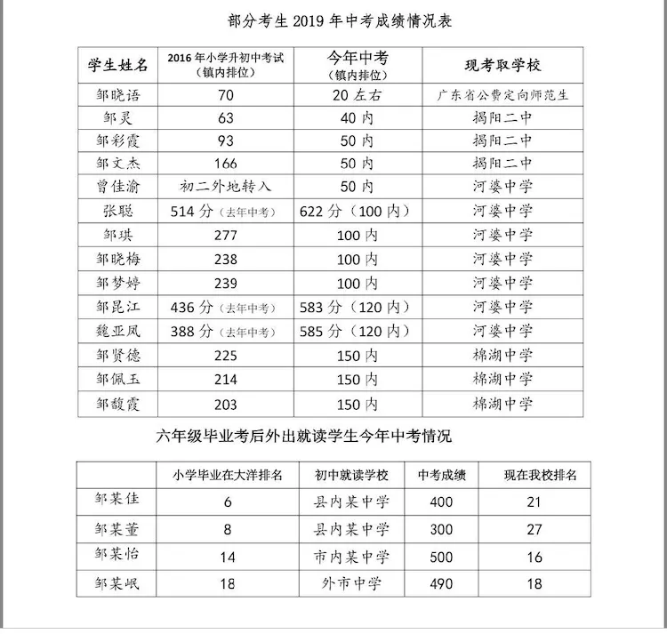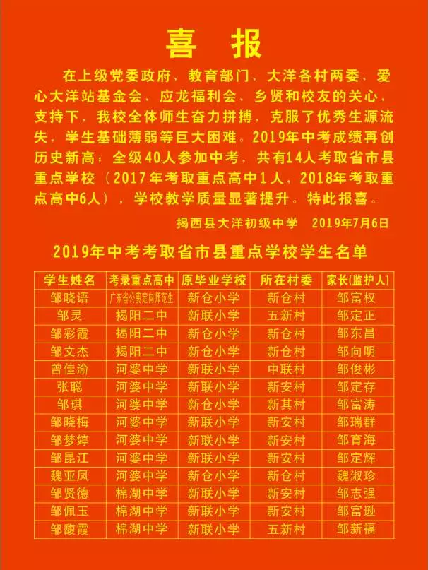 在各级党委政府、教育主管部门、大洋各村两委、爱心大洋站基金会、各界爱心人士和乡贤校友的关心、支持下,我校全体师生奋力拼搏,克服了优秀生源流失,学生基础薄弱等巨大困难。2019年中考成绩再创历史新高:共有14人考取省市县重点学校(2017年考取重点高中1人,2018年考取重点高中6人),学校教学质量显著提升。