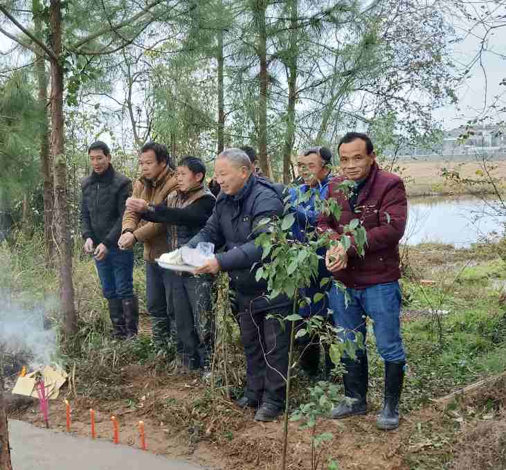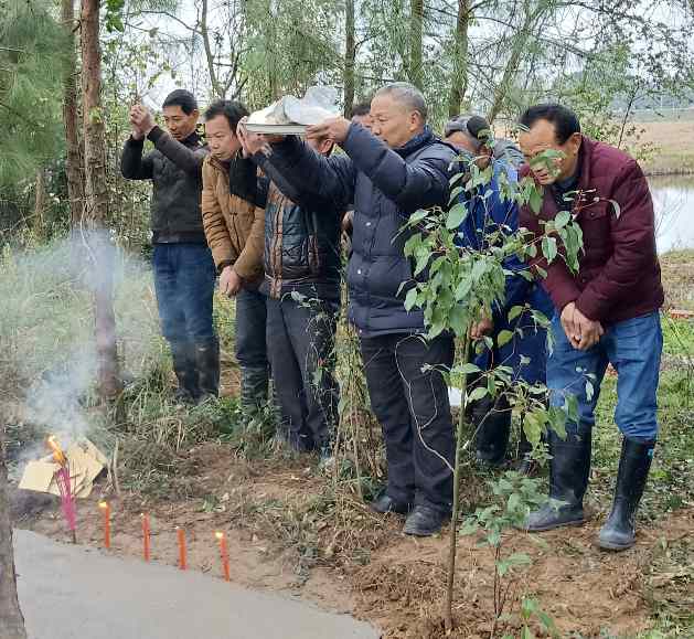 在高上村的祖坟前,所有族亲先斩棘刺、清杂草。高端瑞奉献了两包水泥,高梅瑞奉献了所需沙子,大家一起把老祖宗的坟墓打扫干净后,粉上水泥,让老祖宗的坟墓煥然一新。然后高春祥亲自从高招瑞手中接过从永阳购买来的三牲祭品和烟花火爆,祭祀开始,大家恭敬地向老祖宗三叩首。一鞠躬:祖上荣光、家族兴旺! 再鞠躬:子孝孙贤、千秋鼎盛! 三鞠躬: 枝繁叶茂、 万载兴隆!