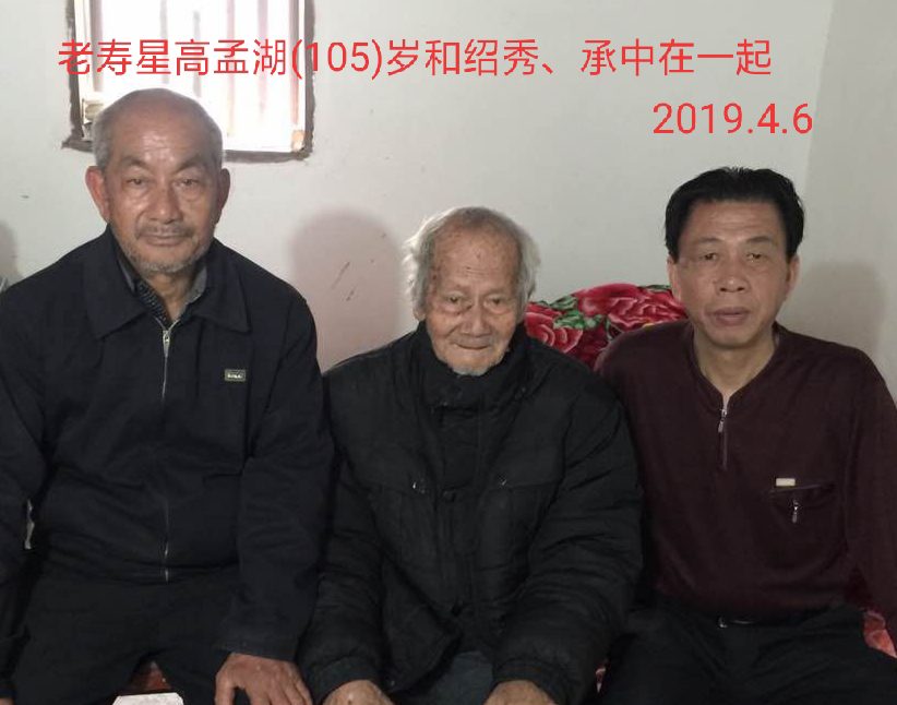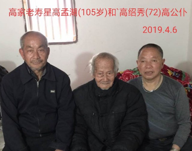 高孟湖老人虽然一百零五岁了,但在这样温馨和谐四世同堂的大家庭里(九个人吃饭)虽然负伤在身,仍然乐观豁达!耳聪目明,见面交谈中仍然记得我。他神清气爽!笑口常开!并再三勉励我们要继续弘扬高家精神,为高氏家族争光!看到他们乐呵呵的一家人多幸福!我们衷心的祝愿老寿星高孟湖身体健康!福如东海、寿比南山!祝愿高绍秀全家吉星高照!人财两盛! 千古孝传! 万载兴隆!