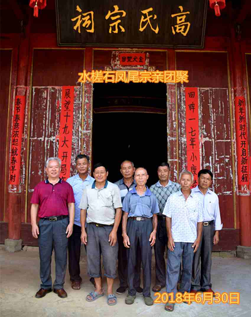 两副对联既叙述了宗祠的地理环境,又记载着我高氏祖先的迁徙历程。石风尾高氏是在康熙五十年间,由绍发公的父亲学生(号兆昇)公,从福建武平济涧迁至江西兴国大坪乡黄田堡竹园坊。在乾隆庚辰年间,由绍发公的长子永兴公从兴国竹园坊迁到泰和县云亭乡二十六都一一阆苑中洞石风尾村定居。承蒙祖宗恩赐,永兴公生了十个儿子,可谓是:枝繁叶茂!后裔昌盛!源远流长!