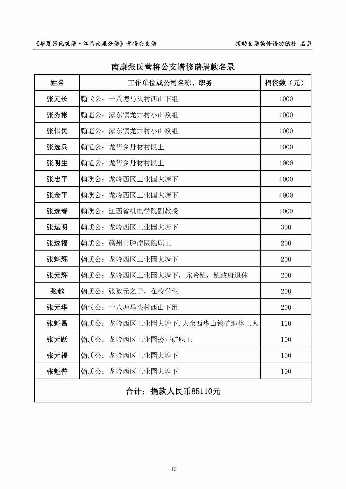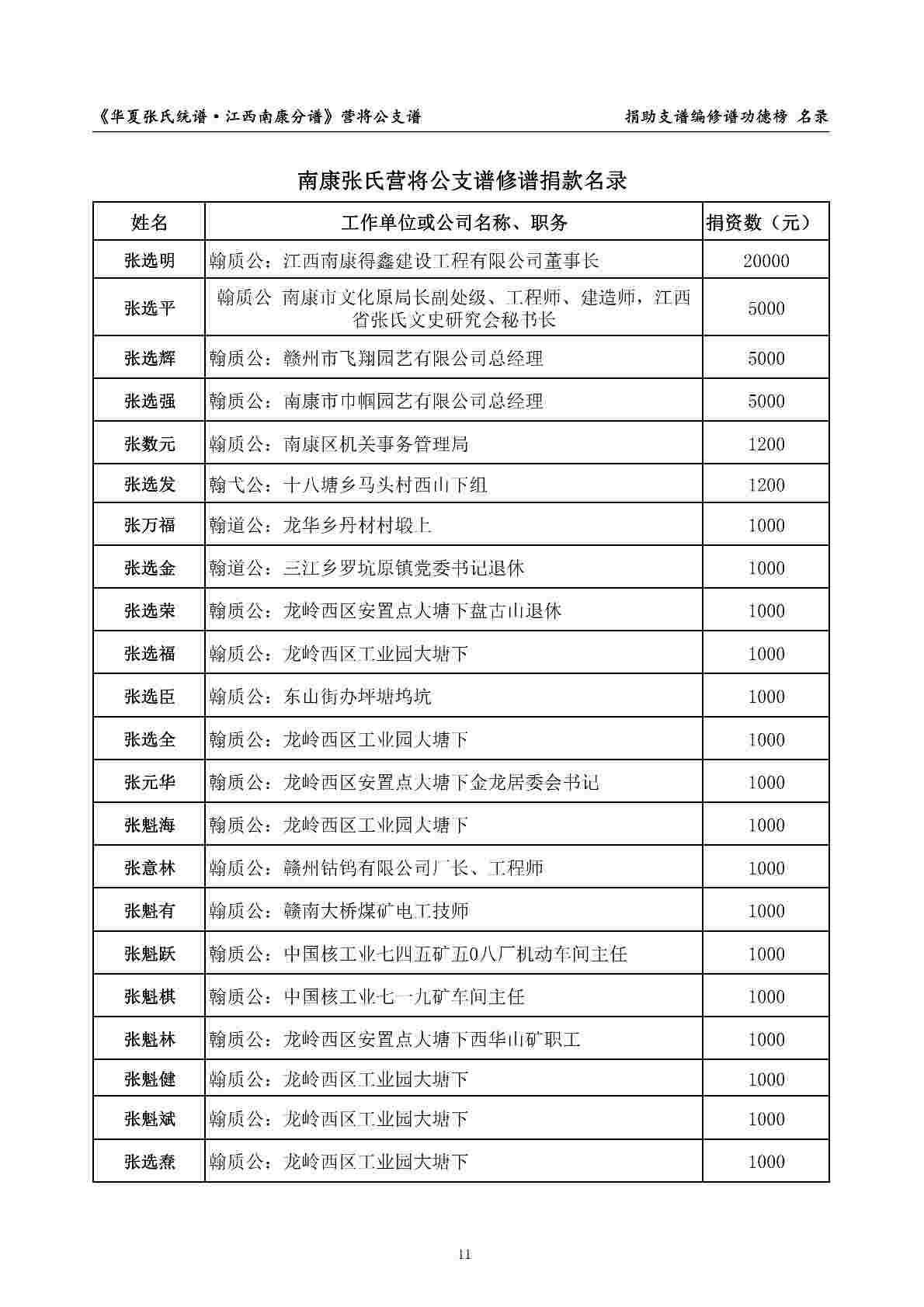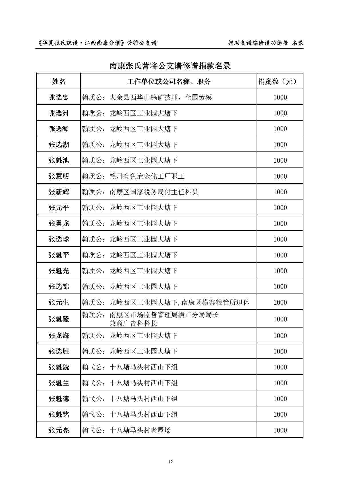 《华夏张氏统谱.江西南康分谱》营将公支谱 捐助支谱编修谱功德榜 名录