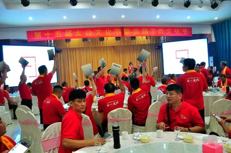 参会代表在获得《中华丁氏源流》一书后,在“首届丁氏文化节”上高高举起该书,对赣州丁氏文化研究会表示深深的谢意!