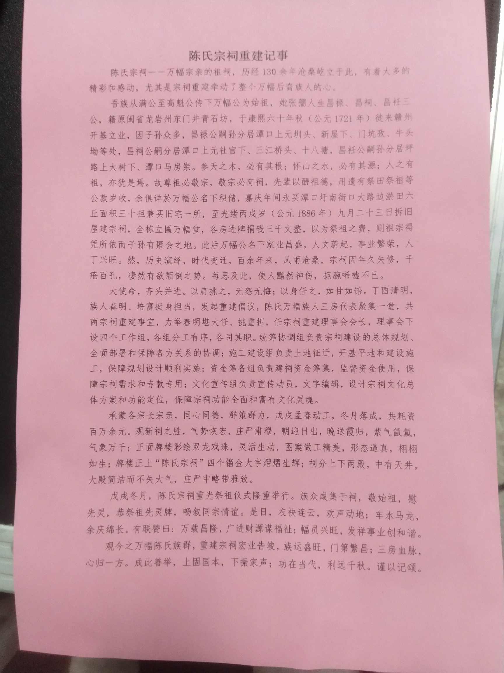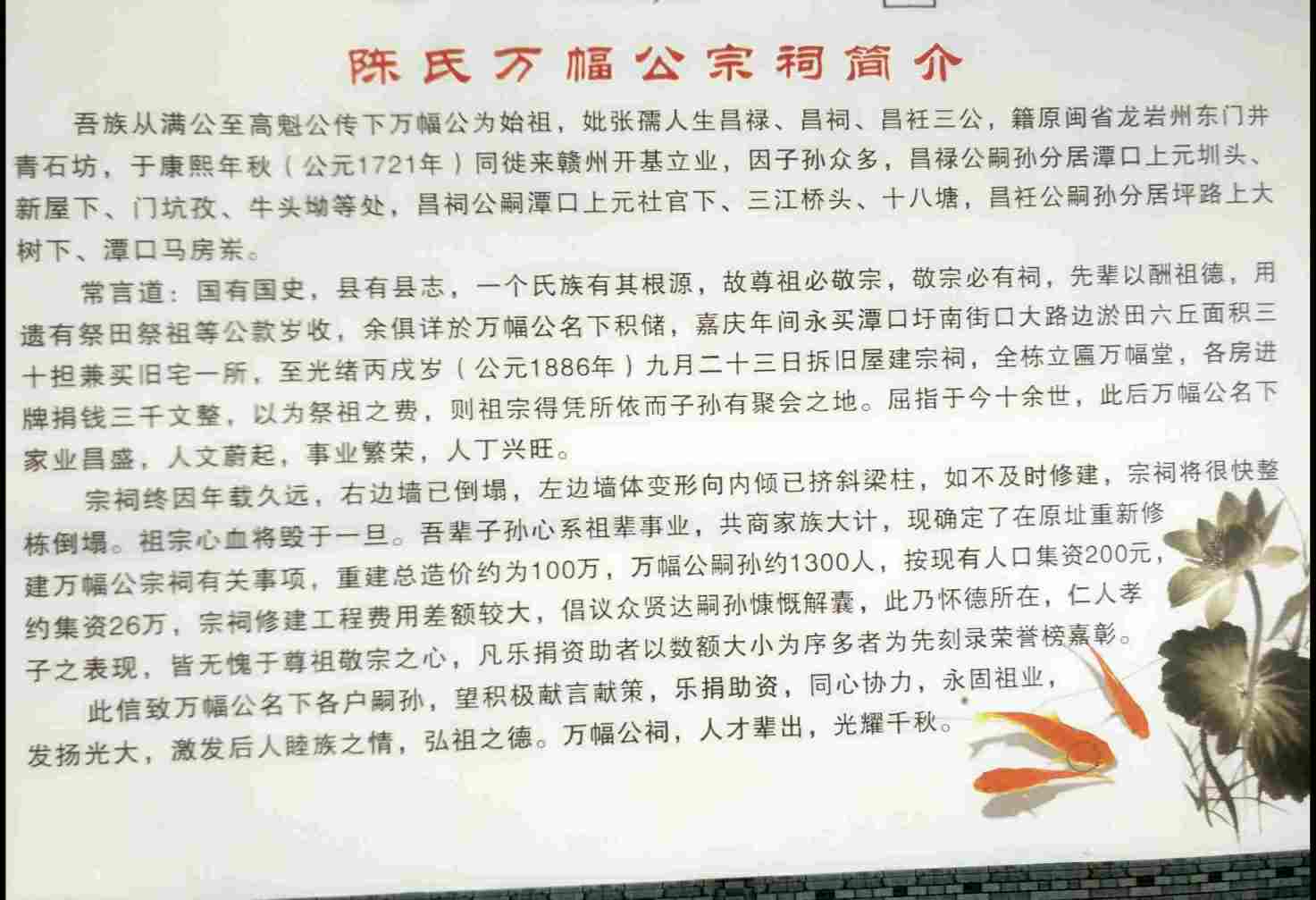 衷心期待万幅公裔孙们的鼎力相助,众人拾柴火焰高,只要每位万幅公后裔都能慷慨解囊,那么相信不久的将来,一幢宏伟壮观的陈氏宗祠将展示在全体宗亲眼前!