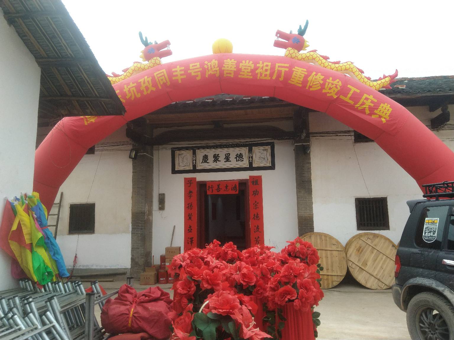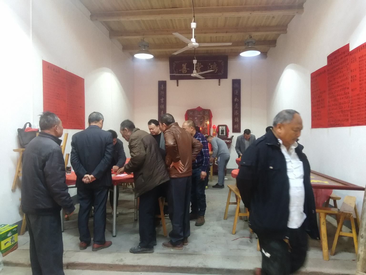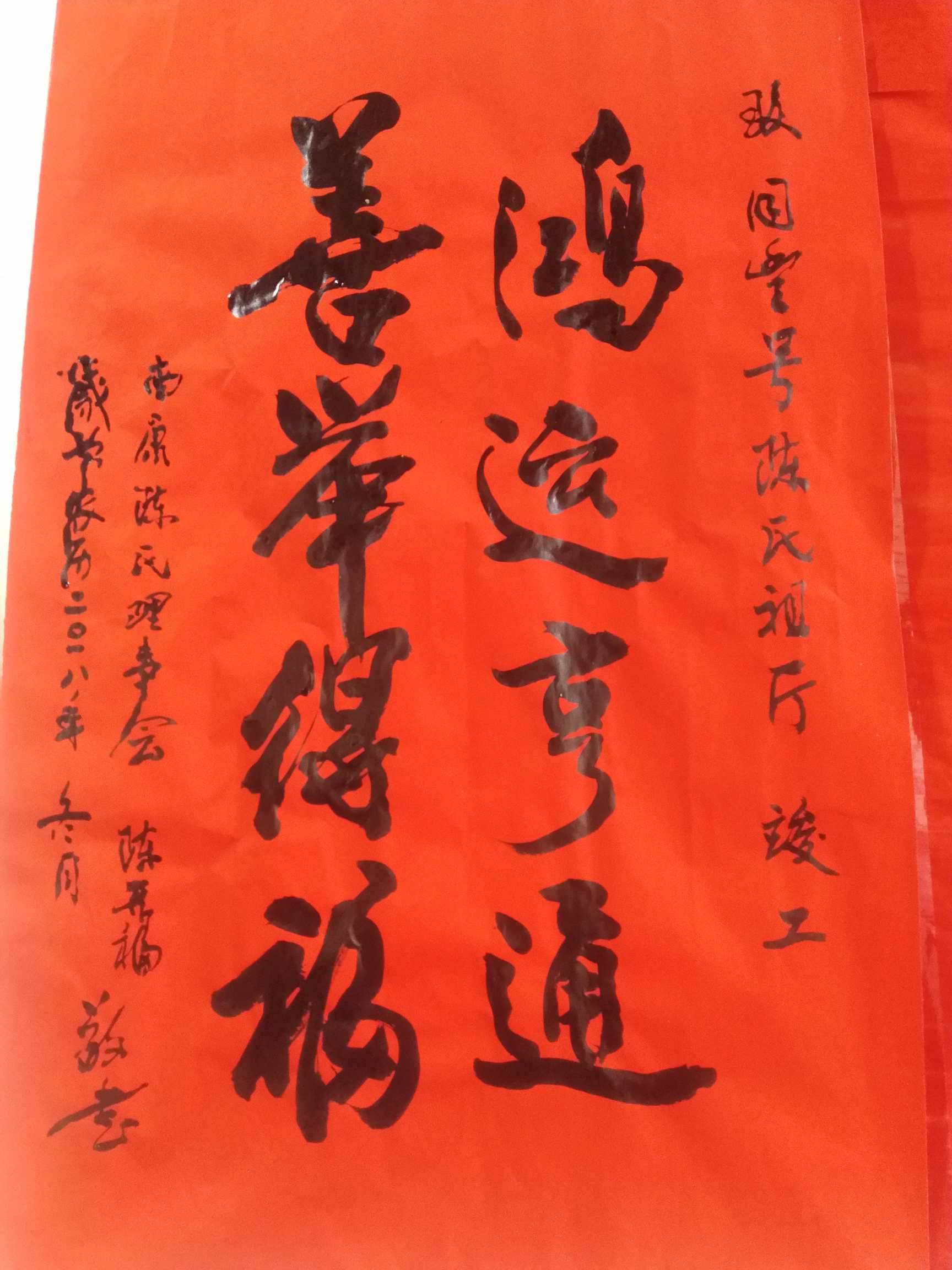 2018年11月25日上午,天气晴朗,南康陈氏联谊会执行会长陈开福率秘书长陈优文,财务总监陈爱金以及爱心企业主陈小明,一行四人,来到潭东镇东坑村,参加同丰号鸿善堂祖厅重修竣工庆典,现场挥毫,书写“鸿运亨通,善举得福”,并发表热情洋溢的贺辞!