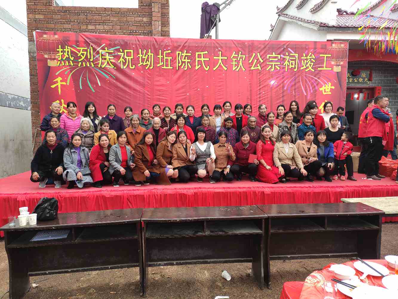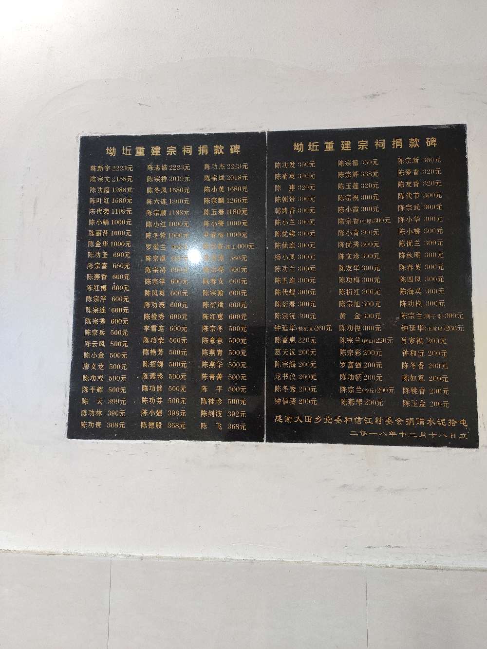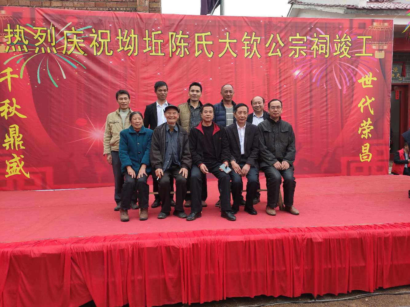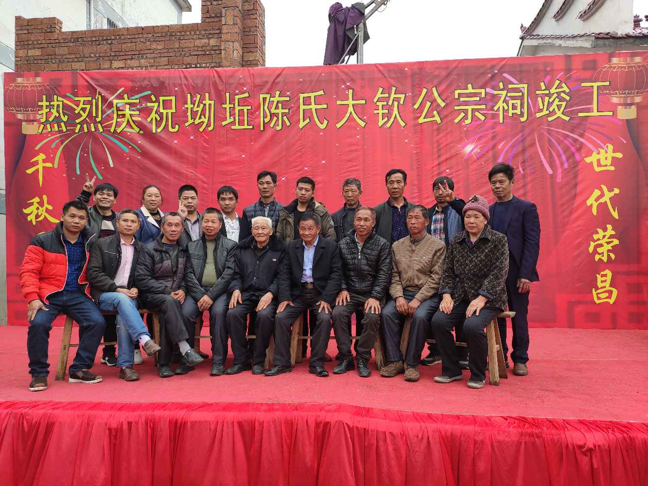 陈氏大钦公宗祠重修竣工庆典在赣县大田乡信江村坳坵成功举行。参加庆典的有先祖两大系的后裔,老大隆发公,老二隆弼公。隆弼公系的总代表陈宗发,隆发公系的总代表陈传谋,峡山代表陈佛林,竹芫村的代表陈志斌。田寮村代表陈传荣,神仙岭上瑞磷堂代表陈代军,峙背村代表陈宗辉,大滩必达堂代表陈长炳,长落龙头代表陈传玉,白田龙舟会代表陈相军,龙口诗茂堂代表,龙舌贵益堂代表等人以及大田乡部分领导和800余位陈氏族亲参加了此次庆典。