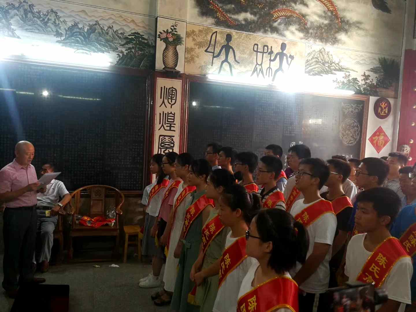 颁奖大会前,19名获奖优秀学子及家长,在南康和谐城陈氏宗祠举行了拜祖仪式。副会长陈清明带领学子宣读了誓词;获奖优秀学子陈安斌、陈怡代表全体获奖优秀学子点烛、点香入鼎,祷告列祖列宗;全体学子向得姓始祖陈胡公满坐像三躹躬。联谊会秘书长陈佳音主持拜祖仪式。