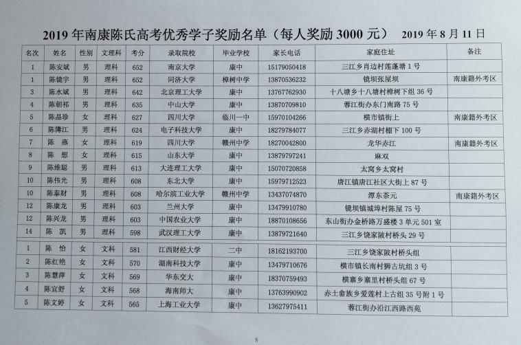 2019年南康陈氏学子高考成绩可谓优异,19名获奖学子中有13名学子,分别以600分以上成绩考入"985"高校,是自2011年以来考入"985"高校人数最多的一年。咱们看看以上获奖名单中的所列情况便知端详。