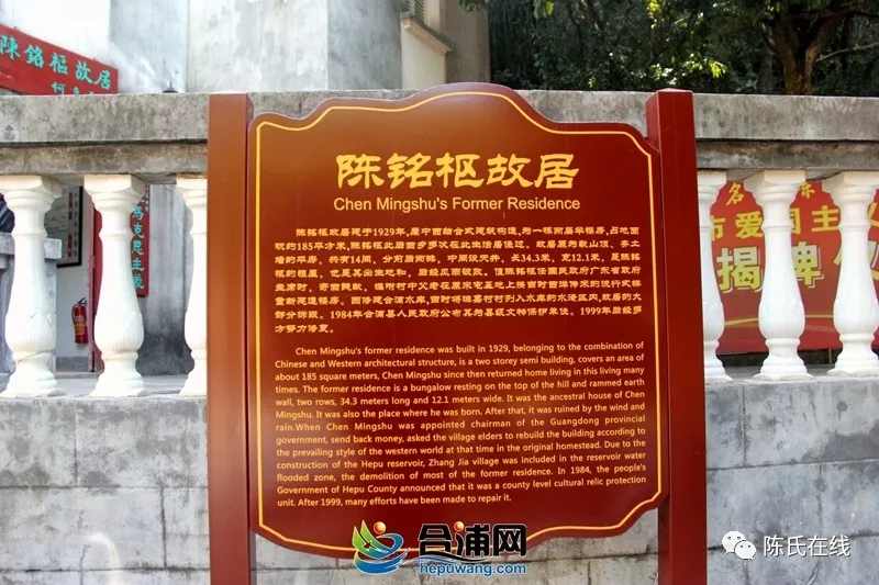 现经修复的陈铭枢故居,是一座充满西洋味而又古香古色的一幢二层的小楼,其地处村边,屹立在一个山坡之上,门前是一条用鹅卵石铺就的跑马道,楼旁就是著名的客家土围城。整幢楼看来,坚固稳重,从中透出一种刚强的力量,就像陈铭枢诗句所说:“中有贞刚气贯虹”。