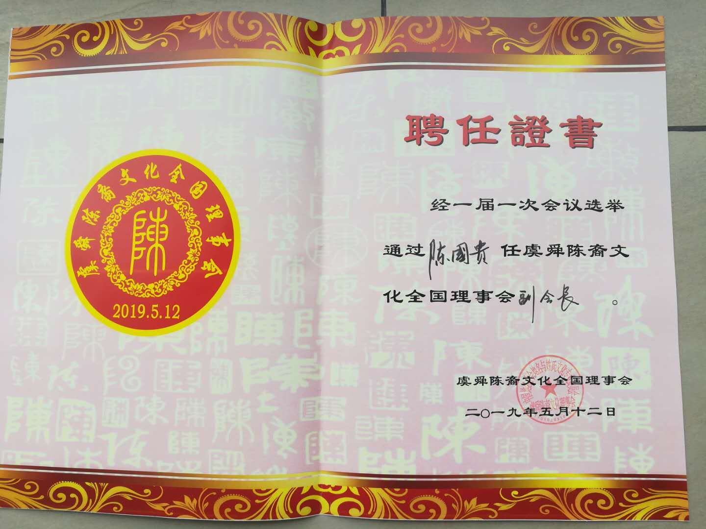 陈国贵先生被聘任为虞舜陈裔全国理事会副会长