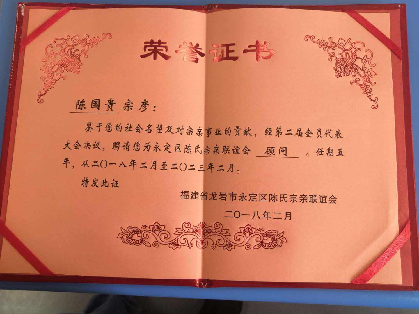 陈国贵先生被聘为永定陈氏宗亲联谊会顾问
