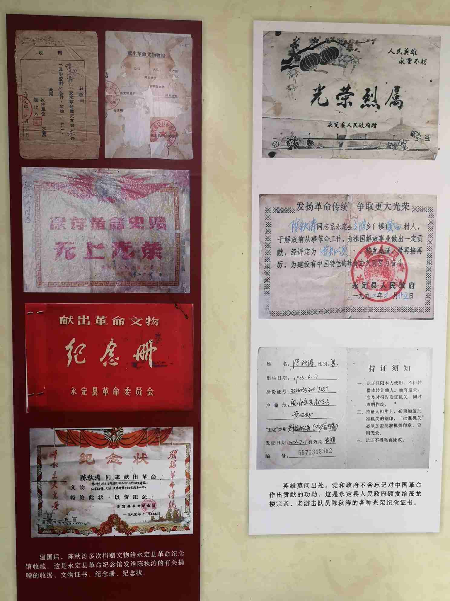 近日,记者在永定县高陂镇黄田村看到,该村老游击队员、老地下党员陈秋涛在家办起了“茂龙楼革命纪念室”,室内摆放着永定县革命委员会颁发的“保存革命史绩,无尚光荣”的奖状、纪念册,还有许多上级有关部门赠送的革命书籍、杂志等。其中,有一本证书特别引人瞩目,那是2007年建军80周年之际,古田会议纪念馆颁发给陈秋涛的“捐献文物荣誉证书”,上面写着:“陈秋涛同志:您于1951年和1957年两次将自己在建国前参加革命工作期间冒着生命危险和付出血的代价而保存下来的十一件珍贵革命文物捐赠给国家,后转到我馆珍藏,精神可嘉,无尚光蒙,特发此证,以资纪念!”在纪念室里,陈秋涛讲述了保存革命文物的经历。