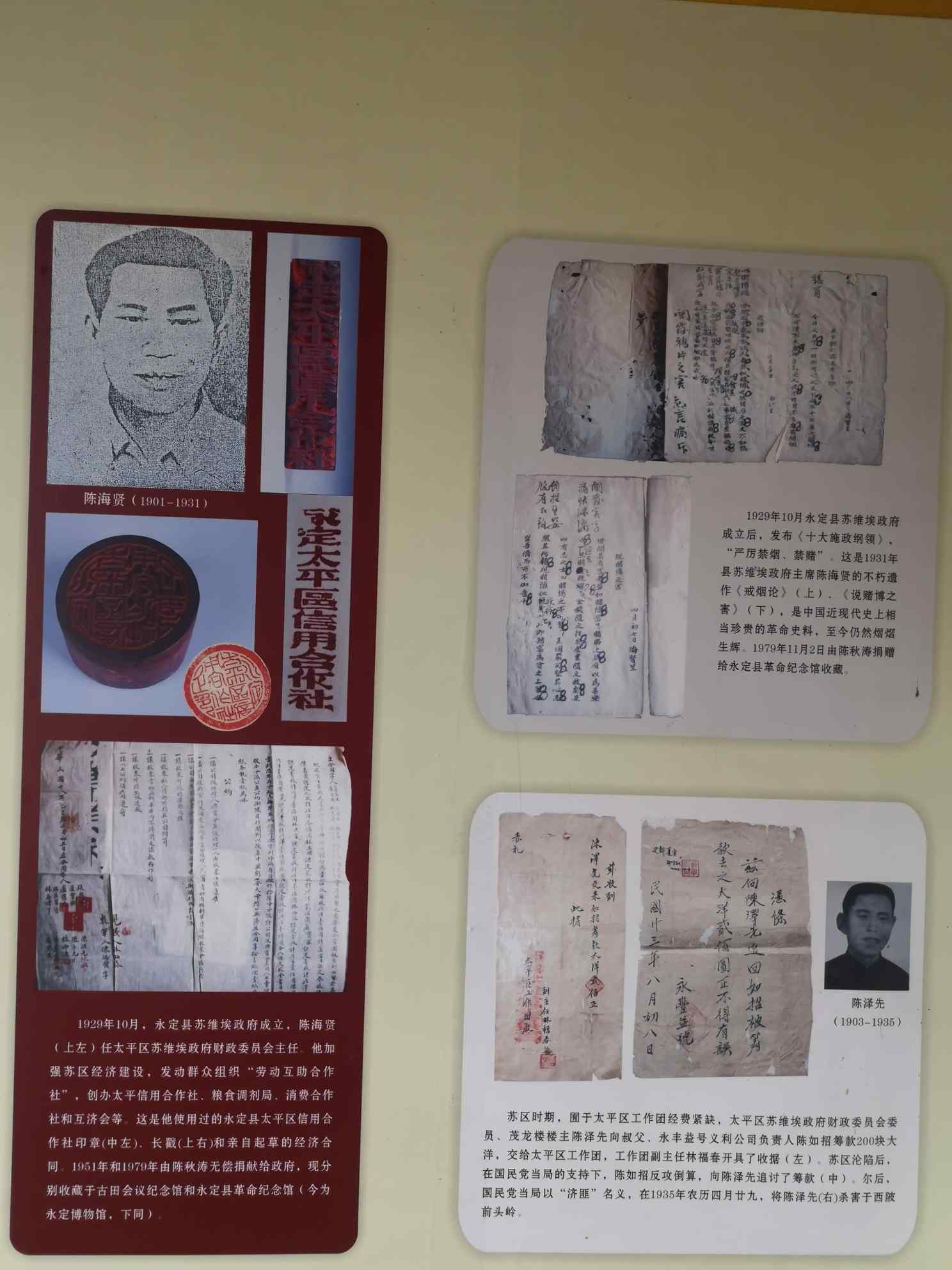 大信用社,消费合作社、互济会、粮食调剂局等,为巩固苏区经济作出了很大努力。4月下旬,他又主持召开了永定县第一次雇农代表会议,出席代表400余人。会议中心是讨论“反富农路线,重新分配土地”等问题。与会代表一致肯定溪南分田经验和中共闽西“一大”政治决议案中的土地革命政策,从而抵制了“左”傾的“地主不分田,富农分坏田”的政策推行,使我县大部分土地革命成果保存下来。5月1日,中共闽粤赣边特委给永定县发出紧急指示信,批评“永定反社党宣传不够,注意力太差”,因此“督促目前应马上迅速加紧这一宣传并用很大的精神去破获其组织与消灭其活动。”因此,县肃反委员会变本加厉地利用“肃社党”的名义,大肆捕杀革命干部和群众,形成了“人人自危,朝不保タ”的严重局面。6月,县苏维埃政府主席陈海贤验收“肃杀党”的“成果”时,发现永定的优秀党团员、县苏领导人及红军指战员已被“肃”掉107人(不包括一般群众),顿时肝裂肠断,几乎昏迷过去。他始终认为这些无辜受害的同志是含冤而死的,因此忿然说了一些对“肃社党”持有不同观点的话。于是立即遭逮捕并加严刑拷打、审问。6月中旬,一身正气、两袖清风的县苏维埃政府主席陈海贤同志在永定南门坝惨遭杀害,时年29岁。建国后,他被追认为烈士。