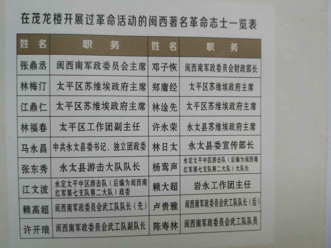 在长期的革命斗争中,曾在“茂龙楼”从事过革命活动的领导人有:太平区苏维埃政府主席林梅汀、郑荣澜、江鼎仁、林淦先。永定县.永太县苏维埃政府主席陈海贤、许永荣,中共永太县委书记、独立团政要马永昌,永太县要宣传部长林日太,永太县游击大队队长张东秀,闽西南红军第七支队第二大队大队长杨鸾声、政委江文波以及后来的岩永工作团主任赖大超,团员、武工队领导许开琅、赖高超、陈寿林、卢贵雅等都以“茂龙楼”为基点开展革命活动和指导革命工作。当时楼内就有多人在永定、永太县委、县苏维埃政府主要领导人的率领下参加了革命工作。其中,楼主陈泽先和陈其先,均先后担任区、乡苏维埃政府主要领导职务。特别是陈泽先在艰苦卓绝的三年游击战争中,以及担任太平区苏维政府财政委员期间,为解决红军游击队和地下工作人员的给养问题,而积极开展打土豪,筹款子等工作。陈泽先在筹款过程中,有一次,曾亲自出面向其叔叔陈如招筹款大洋贰佰元以支持革命。后不料在敌人大规模清剿时,陈如招即行反攻倒算,向陈泽先追还款,造成对革命极其不好的影响。当时,陈泽先为了保护革命利益,在永太县委、县苏维埃政府主要领导人马永昌、许永荣及政委江文波等的领导和支持下,坚决执行在“茂龙楼”内召开的会议决议,积极配合游击队将其叔镇压,在当地一时传为佳话。这起为了革命大义灭亲事件震惊闽西,起到了良好的作用。但此事发生后,便遭到了敌人的残酷报复。于1935年农历四月廿八日,国民党军驻西陂天后宫的谷团部便派出伪军30多人,将“茂龙楼”团团包围,陈泽先即遭逮捕,被关进西陂“双寿堂”,关押期间,受尽严刑拷打,但他始终坚贞不屈,保守了党的秘密,次日英勇就义于西陂前头岭。不久,其母、妻、儿亦遭迫害而被捕入狱,受尽严刑,惨不堪言,最后虽经组织营救脱险,但仍遭到数人无理勒索之苦。