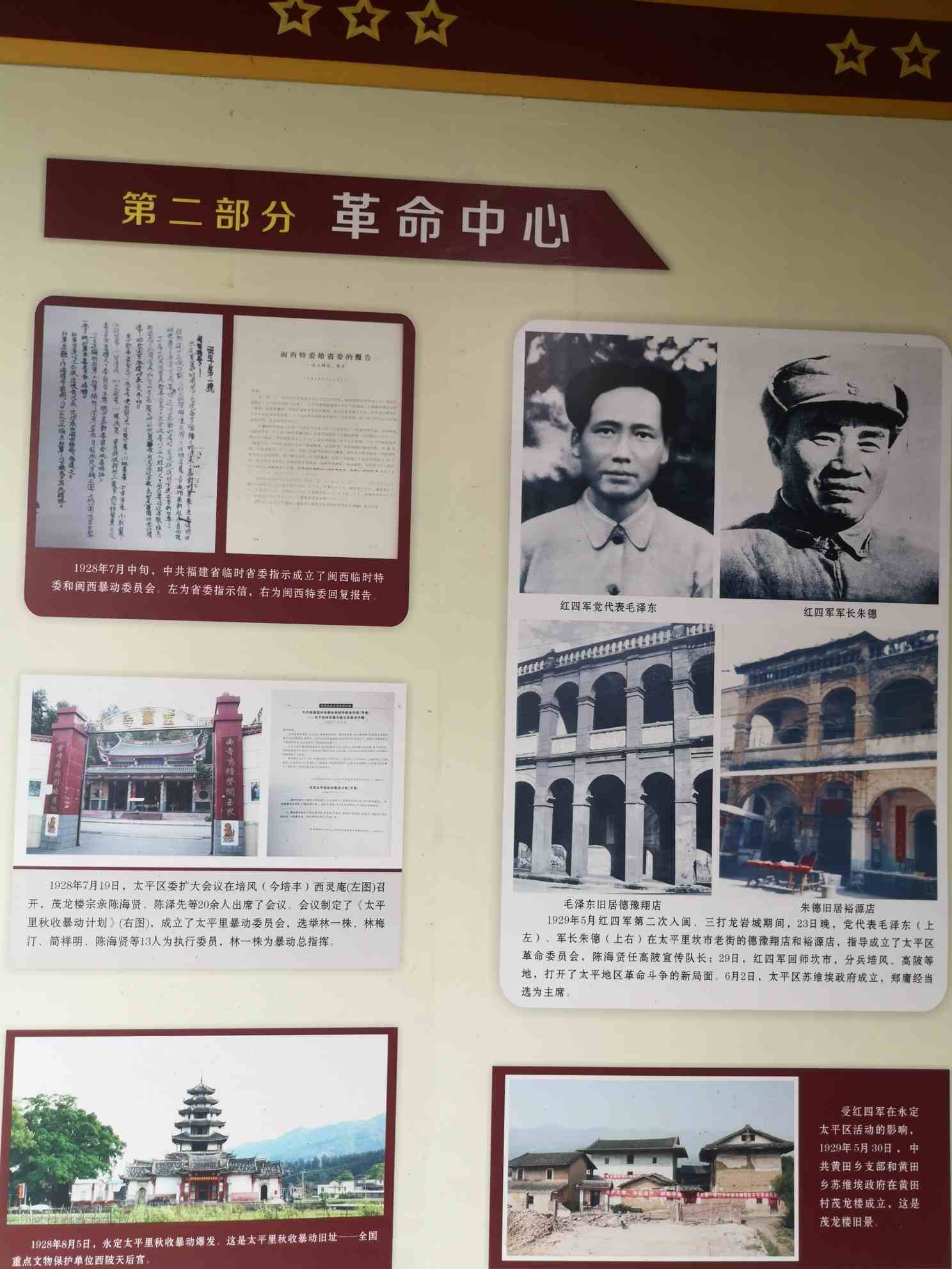 1929年5月,当毛泽东、朱德率红军入闽解放永定后,在各地先后相继建立党和政权组织时,“茂龙楼”就是中共黄田乡支部成立旧址之一。当时在该楼内召开过多次会议,先后发展的觉员有陈海贤、陈弼周、陈滨美、陈泽先、魏接香、陈东喜等20余人。黄田支部建立后,重视人才的培养,先后不少党员在苏维埃政府和红军里曾担任过重要职务,如:陈海贤任永定苏维埃政府主席,陈东喜任红軍二十军团长,魏东扬任闽西雇农工会主席,魏锦香任太平区工会主席兼太平区高级劳动小学校长,陈桂林任红军十二军营长,陈泽先任太平区苏维埃政府财政委员,陈弼周、陈滨美、陈其先、卢根旺、陈维来等同志曾先后任过乡苏维埃政府主席等职,对革命作过重要贡献。其中又特别的是:当时楼主,共产党员陈泽先同陈海贤、陈东喜、陈桂林、陈粥周、魏国香、卢根旺、魏瑞香、魏如山、魏东扬、林洪龙、魏锦香等同志均先后为人民共和国献出了室贵的生命,丰功伟绩,令人敬仰。