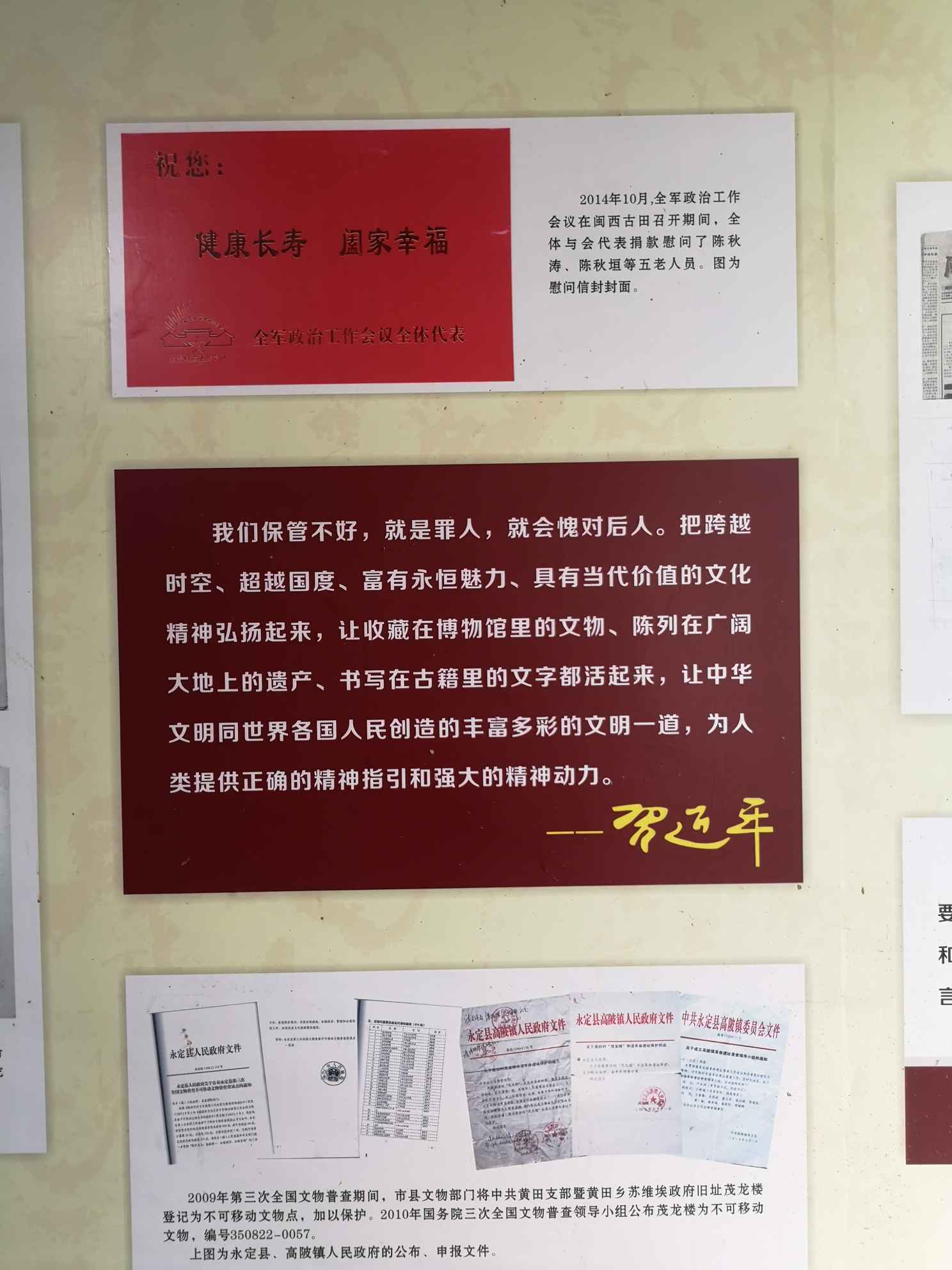 为了贯彻执行习近平同志关于“让收藏在博物馆里的文物、陈列在广阔大地上的遗产、书写在古籍里的文字都活起来,让中华文明同世界各国人民创造的丰富多彩的文明一道,为人类提供正确的精神指引和强大的精神动力”的重要指示,为了缅怀革命先辈的丰功伟绩,为了保护好珍贵的革命文物,为了更好地教育后代、启迪后人,建国后,陈泽先烈士之子、革命“五老”人员、永定县林业局干部陈秋涛同志不忘根本,继承和发扬革命传统,多次主动把其在地下游击队、武工队工作时冒着生命危险珍藏于茂龙楼内的大批珍凌革命文物捐赠:给国家,后分别入藏于福建省革命历史博物馆、古田会议纪念馆、永定博物馆等处;进入21世纪以来,茂龙楼裔孙更是克服自身困难,多方查访,收集资料,筹资举办了《茂龙楼革命史迹展》,展示若干珍贵历史照片和文物资料图片,打造了一个传承宗族好作风的精神家园。