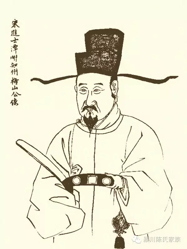——舜公第一百二十二世孙-满公第八十九世孙-(魁公之后-仲八郎公长子)梅山公,与梅宗公、梅嵩公、梅佐公、梅安公、梅玉公六兄弟,世称“六梅”。“六梅”均为魁公称为“五山”的五子“昆、仑、嵩、岳、峰”中的嵩山公之后,又都是于宋理宗淳佑年间(公元1241-1252年)陆续迁出宁化石壁,被后人尊为“五山六梅派”。梅山公于公元一二四三年中举,历任潭州(今长沙)太守、浩授中宪大夫,家室迁上杭县捻田丰朗村塘背,夫人郑氏、金氏生百一秀、百二进、百三郎三子。百一秀公长子千一郎公,于公元一三零六年迁入上杭旧县,是旧县陈氏的开基始祖……