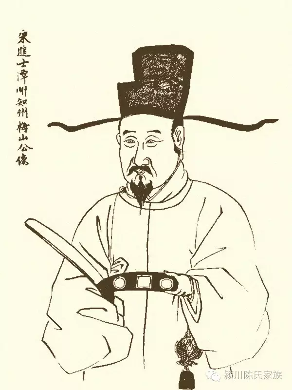 梅山公,小字七十郎,宋淳佑癸卯(1243年)举人,历任潭州(今湖南长沙)太守。由福建宁化石壁迁上杭县胜运里(今稔田镇)丰朗村塘背开基为入杭始祖。梅山公长男百一秀世居丰朗村,次男百二进迁溪南里(今属永定)金砂村,三男百三郎徙溪南里田心村。百一秀生七子:千一郎、千二郎、千三郎、千四郎、千五郎、千六郎、千七郎。千一郎公移在城里,生四男。长房日新公迁旧县开基,今旧县乡河东、河西、龙溪、铁场、铁东、角龙及才溪陈屋等村,均分布有他的裔孙,以千一郎公为一世祖记代。第四房念四郎公之孙贵德公在城区西街天王寺前开基;孙贵寿公原居庐丰乡额里村,十三代时均迁江西武宁县大峙里开基。千二郎公之孙均政公、千三郎公裔迀长汀,千四郎公之孙均得公、均亮公、友忠公三系世居丰朗,其中均公得次房孙宗义公迁黄砂口开基,均得公三子仲端公六世孙有福公迁芹菜坑开基,仲端公的九世孙玩岐公迁白砂洋善坑开基;千四郎公第三房孙友庆公迁中都管坑开基、志和公迁庐丰水竹湖开基;第六房石生公徙居旧县梅溪村,其九世孙成玉公迁临城玉女村陈岭上开基,六世孙积公迁旧县铁场梅子角开基,后裔迁浙江龙泉市及本邑南阳双溪开基。千五郎公徙居惠州博罗县,裔孙返迁蛟洋邹坑芙榕村,九世裔孙石财公迁南阳双溪田。千六郎公辗转迁徙终迁临城白玉村开基为一世,五世孙清公迁旧县水东村开基。千七郎公三世孙炉公在通贤大东村黄岐岭下开基。