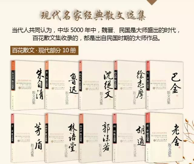 当代人共同认为,中华五千年中,魏晋、民国是大事盛出的时代,百花散文集收录的都是出自民国时期的大师作品。朱自清、鲁迅、沈从文、徐志摩、巴金、茅盾、林语堂、郭沫若、胡适、老舍,还有汪曾祺、贾平凹、宗璞、季羡林名家散文选集。