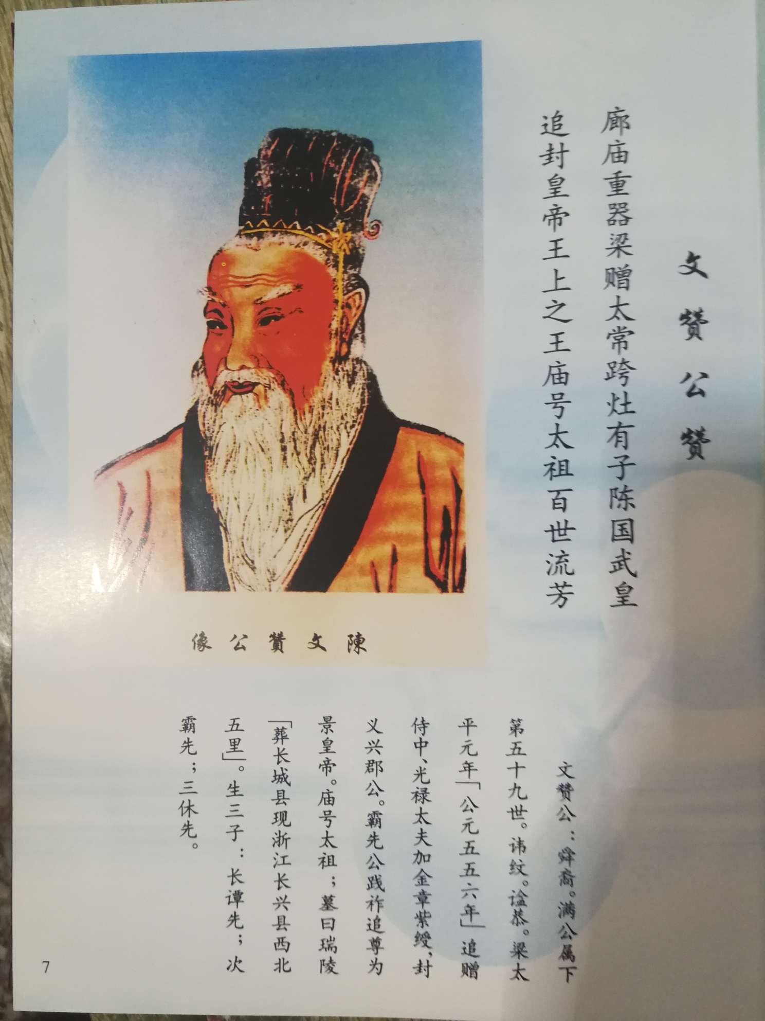 陈文赞,陈氏59世裔孙,是汉太丘长陈寔十七世孙,生三子:陈谭(谈)先、陈霸先、陈休先。陈谭先仕梁,为东宫直阁将军,侯景之乱,于太平二年(557)在城中抗敌被流矢射中而卒。陈霸先,字兴国,初仕梁,曾辅佐王僧辩讨平侯景之乱。天成元年(公元555),杀僧辩,立敬帝,自为相国,封陈王。太平二年(557),接受梁禅,改元陈朝,都建业,在位三年,号武帝,庙号高祖。陈霸先驾崩后,由陈谭先长子陈蒨继位,即陈文帝。陈文帝驾崩后,由子陈伯宗继位,即陈废帝。陈废帝驾崩后,由陈谭先次子陈顼继位,即陈宣帝。陈宣帝生四十二子,六子陈叔明受封为宜都王,十七子陈叔达受封为义阳王。陈文赞所传子孙派系称"南朝派"。南朝派陈氏播迁人潮汕的有以下两大派系: