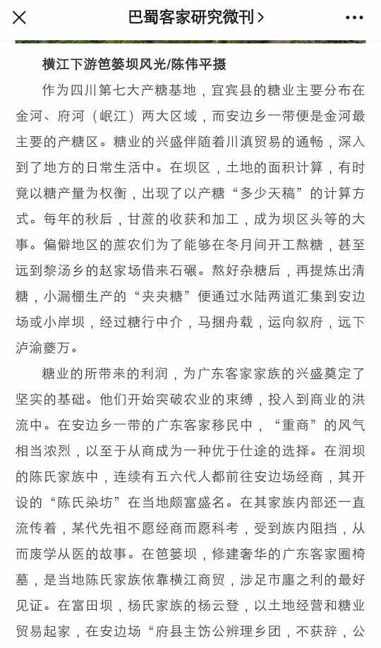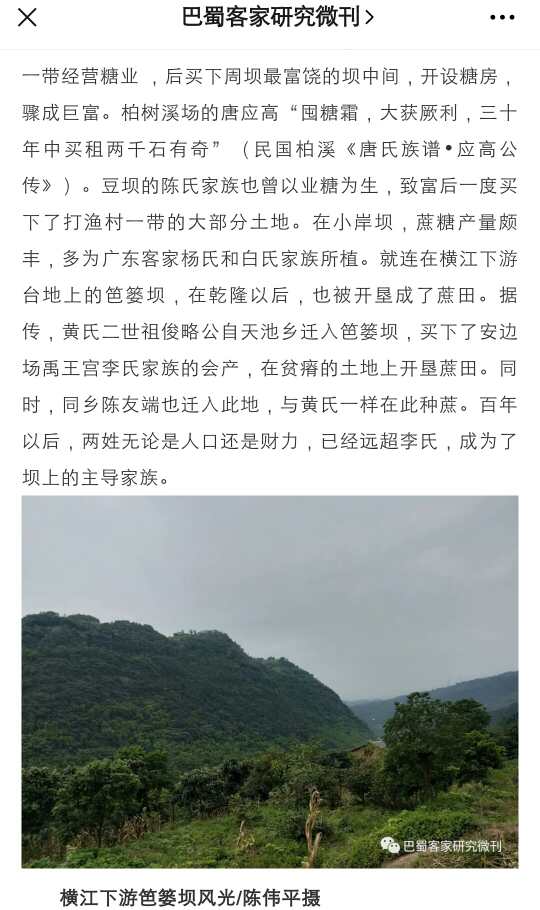 梳爬安边乡乃至附近豆坝、天池乡的历史,可以发现,这样的移民格局并非是一来既成。原来的坝区多数为土著旧业,但是洪水的侵袭和对坝土开发技术的落后,制约了土著对坝区的控制能力。但对于新移民而言,其“农事精能,均极播种之法,多粤东、湖广两省人”(同治《成都县志•卷十二风俗》)。尤其是广东客家移民,身处近海,常与风潮相争,尤熟稔经济作物种植之法,故而砂土为主的坝区反而为他们的落脚提供了有利的条件。从宜宾城往西的金河两岸,各坝从清代中叶以来便已成片播种甘蔗。如天池坝“栽培作物以甘蔗为最多……除甘蔗外,间有烟草与芝麻”(民国杨予英《宜宾实习调查日记》)。天池坝以上的周坝、打渔村、豆坝、小岸坝皆是蔗田密布,糖房众多。而这些地区,基本上都是广东客家人的聚居区域。如周坝唐氏自隆昌来,便在天池坝龙神堂一带经营糖业 ,后买下周坝最富饶的坝中间,开设糖房,骤成巨富。柏树溪场的唐应高“囤糖霜,大获厥利,三十年中买租两千石有奇”(民国柏溪《唐氏族谱•应高公传》)。豆坝的陈氏家族也曾以业糖为生,致富后一度买下了打渔村一带的大部分土地。在小岸坝,蔗糖产量颇丰,多为广东客家杨氏和白氏家族所植。就连在横江下游台地上的笆篓坝,在乾隆以后,也被开垦成了蔗田。据传,黄氏二世祖俊略公自天池乡迁入笆篓坝,买下了安边场禹王宫李氏家族的会产,在贫瘠的土地上开垦蔗田。同时,同乡陈友端也迁入此地,与黄氏一样在此种蔗。百年以后,两姓无论是人口还是财力,已经远超李氏,成为了坝上的主导家族。