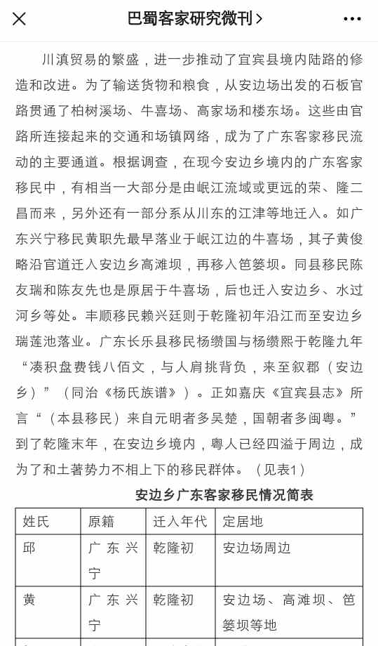 安边乡境内广东客家人的出现,是清代川滇交通和经济发展的结果。乾隆九年,滇铜京运水陆两道的打通,使横江成为川滇物资交流最重要的渠道之一。从云南昭通府北运的铜船,从豆沙关起,历经盐井渡、普洱渡、老鸦滩、横江场,都会在安边场蛮津渡停靠,由此再下柏树溪,一直沿江行至叙州府和泸州(蓝勇《四川古代交通路线史》)。铜船的停靠,也带动了沿线商业的繁盛。从横江一带运送而来的滇货和粮食,从金江上游运来的石材、木材和山货,日夜不停,经过安边乡境内而流转。过往的商船不但停满了安边场外的金河沿岸,就连对河的小岸坝一带,也是船只云集,堆栈密布。川滇贸易的繁盛,进一步推动了宜宾县境内陆路的修造和改进。为了输送货物和粮食,从安边场出发的石板官路贯通了柏树溪场、牛喜场、高家场和楼东场。这些由官路所连接起来的交通和场镇网络,成为了广东客家移民流动的主要通道。根据调查,在现今安边乡境内的广东客家移民中,有相当一大部分是由岷江流域或更远的荣、隆二昌而来,另外还有一部分系从川东的江津等地迁入。如广东兴宁移民黄职先最早落业于岷江边的牛喜场,其子黄俊略沿官道迁入安边乡高滩坝,再移入笆篓坝。同县移民陈友瑞和陈友先也是原居于牛喜场,后也迁入安边乡、水过河乡等处。丰顺移民赖兴廷则于乾隆初年沿江而至安边乡瑞莲池落业。广东长乐县移民杨缵国与杨缵熙于乾隆九年“凑积盘费钱八佰文,与人肩挑背负,来至叙郡(安边乡)”(同治《杨氏族谱》)。正如嘉庆《宜宾县志》所言“(本县移民)来自元明者多吴楚,国朝者多闽粤。”到了乾隆末年,在安边乡境内,粤人已经四溢于周边,成为了和土著势力不相上下的移民群体。